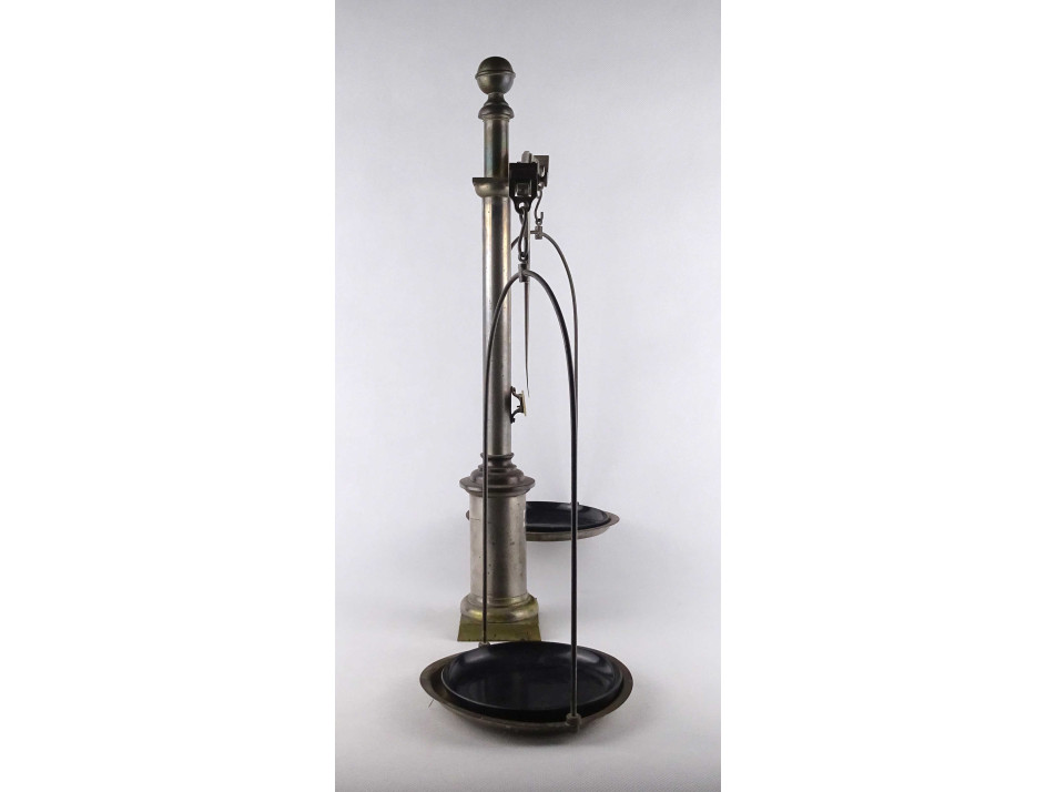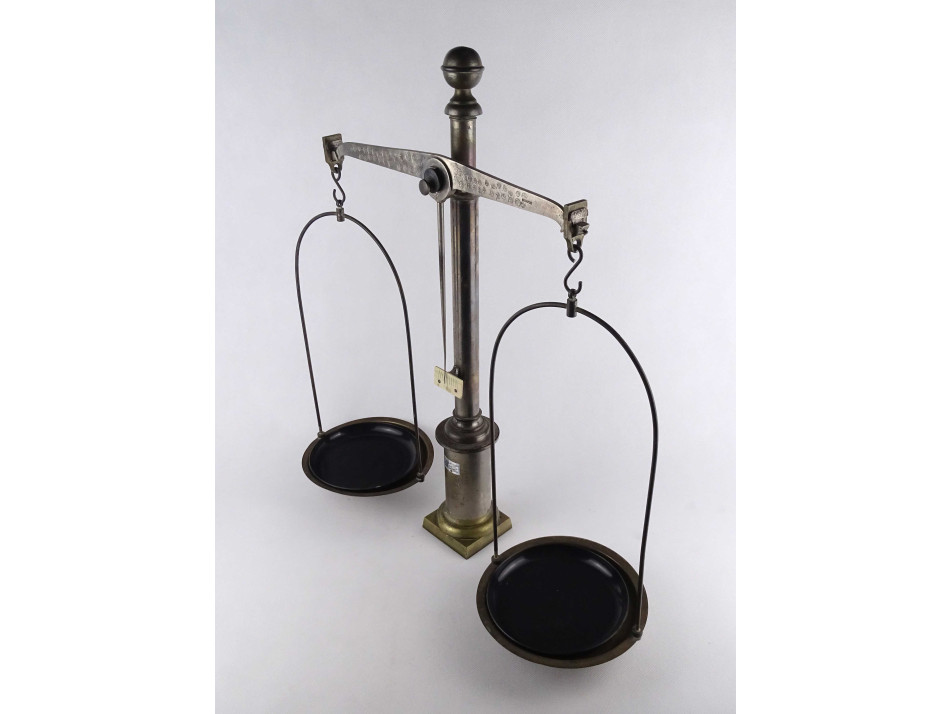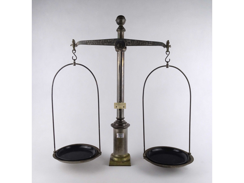 Régi, kétkaros fém szerkezetű gyógyszerész mérleg. A tálcákban fekete műagyag betétek találhatóak. A karokon számos hitelesítő pecsét láthatók. Valószínűleg eredetileg fa talapzaton állhatott. Inkább dísztárgynak, vagy alkatrésznek alkalmas.