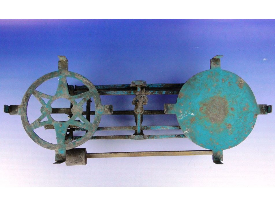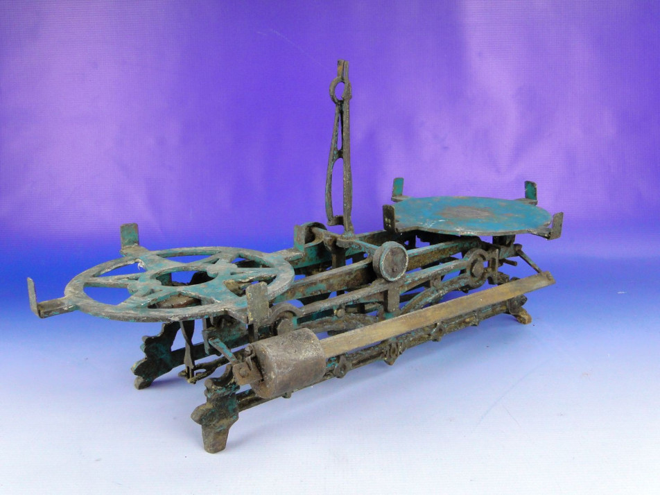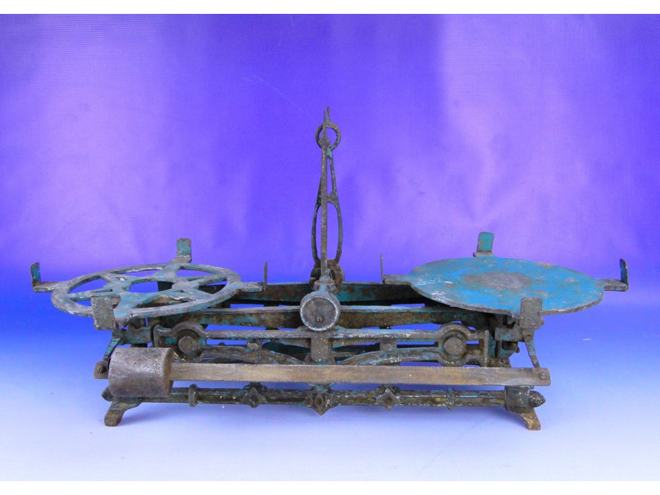Antik öntöttvas nagyméretű 10 kilós kétkarú konyha vagy piac mérleg.