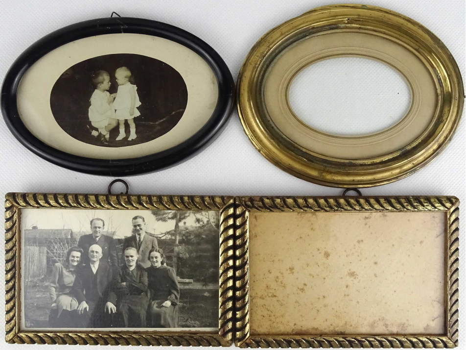 Régi, szép állapotú, vegyes, kis méretű képkeret fotó keret csomag, 4 darab. Két egyforma szögletes aranyozott fakeret és két különböző ovális keret, egy fekete fa és egy aranyozott fém keret.