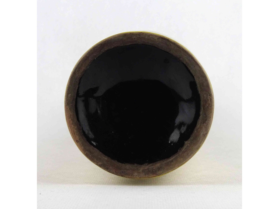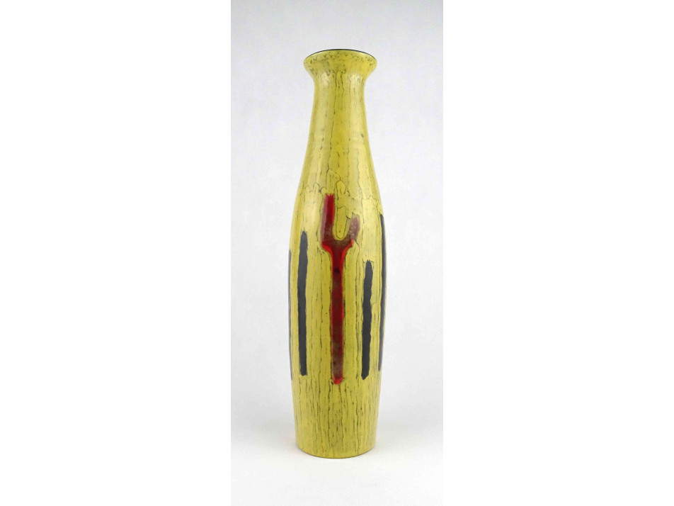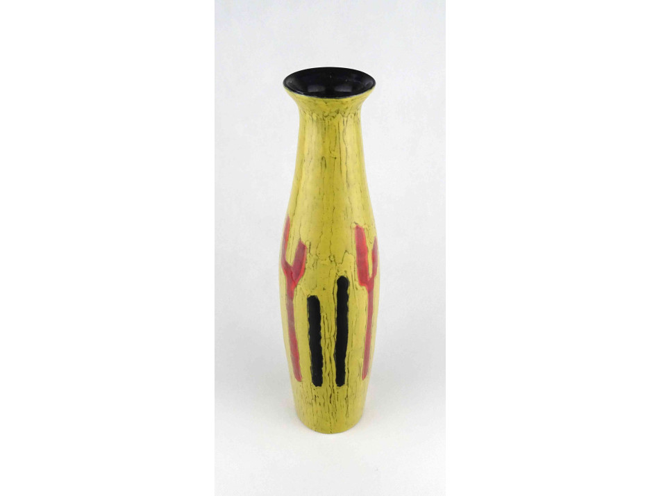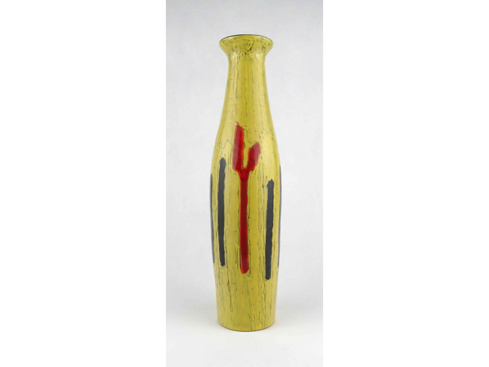 Hibátlan állapotú, jelzetlen, karcsú és magas retro, sárga mázas geometrikus mintákkal díszített kerámia iparművészeti váza, díszváza.