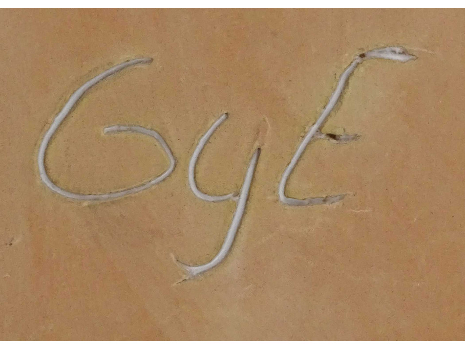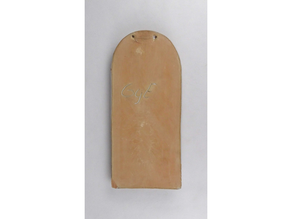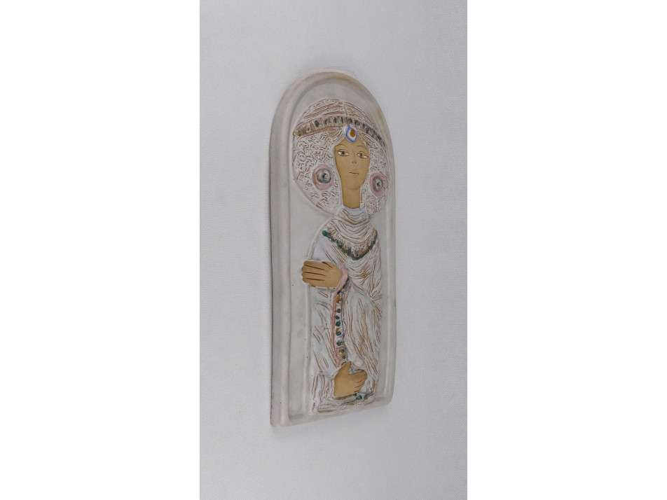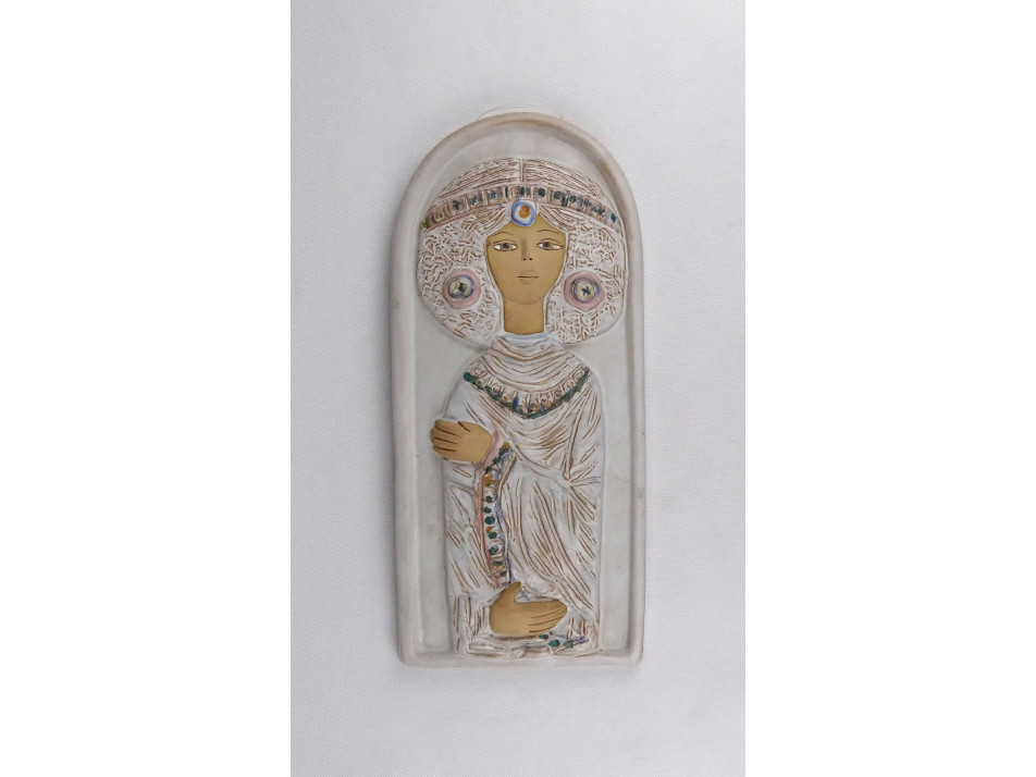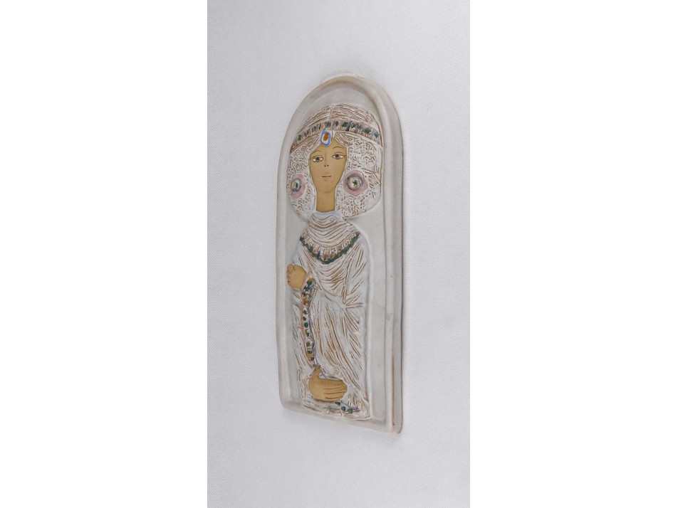 Szép állapotú, előkelő, talán egyiptomi nemes nőt, hölgyet, ábrázoló jelzett Győrbíró Enikő kerámia falidísz, dombormű. A hátulján, a bal alsó sarokban egy lepattanás található.