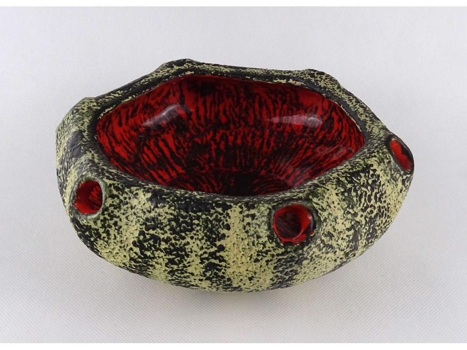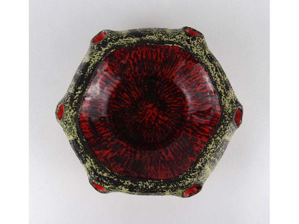 Retro, nagy méretű, hibátlan állapotú, mid century design Pesthidegkúti kerámia asztalközép vagy kaspó, amely akár függesztve is használható. A hatszögletű, magasfalú tál kívül matt sárga - zöld mázas, belül pedig fényes piros és fekete.