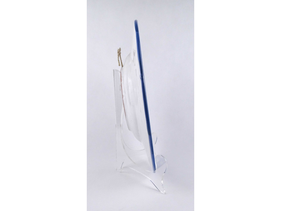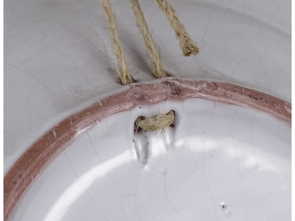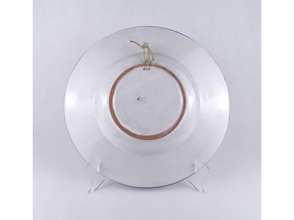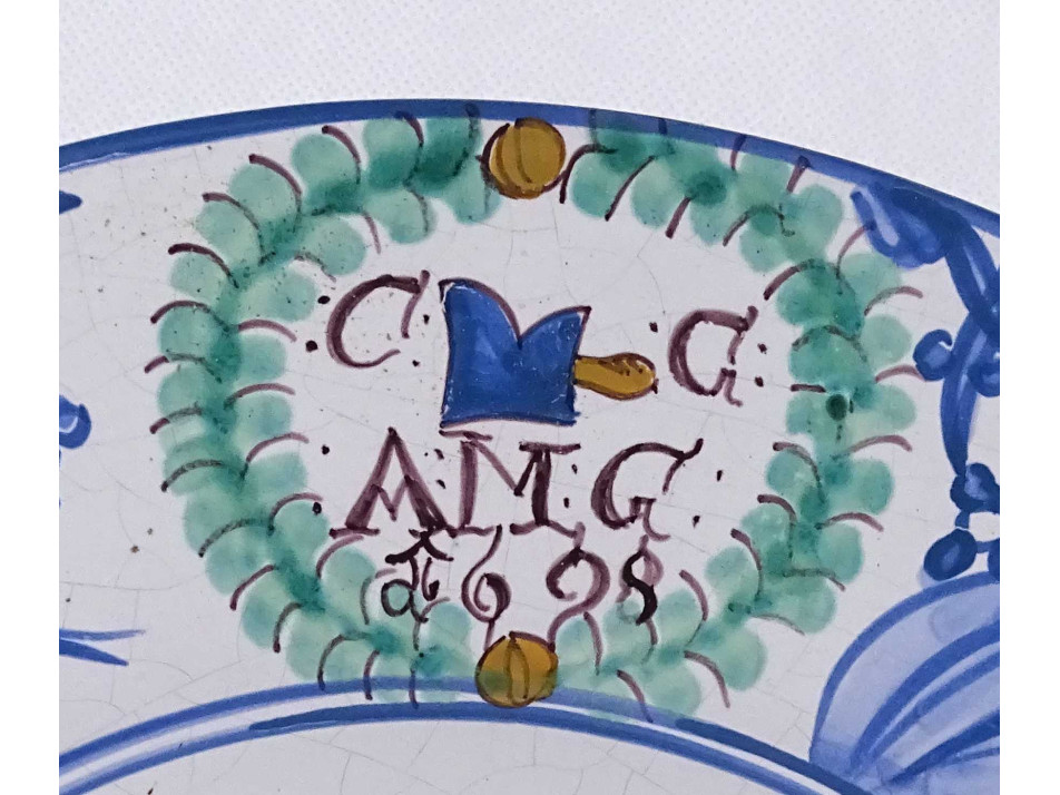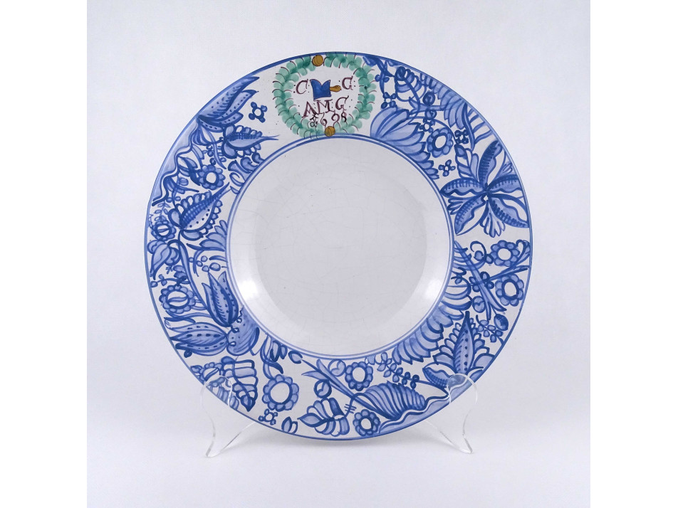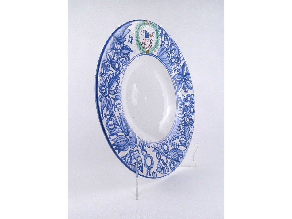 Gyönyörű, kézi festésű habán motívumokkal díszített nagy méretű kerámia fali tányér, falitál. Akasztási lehetőséggel rendelkezik. Múzeumi másolat, az eredeti 1698-ban készült, ez a dátum látható ezen a tálon is: