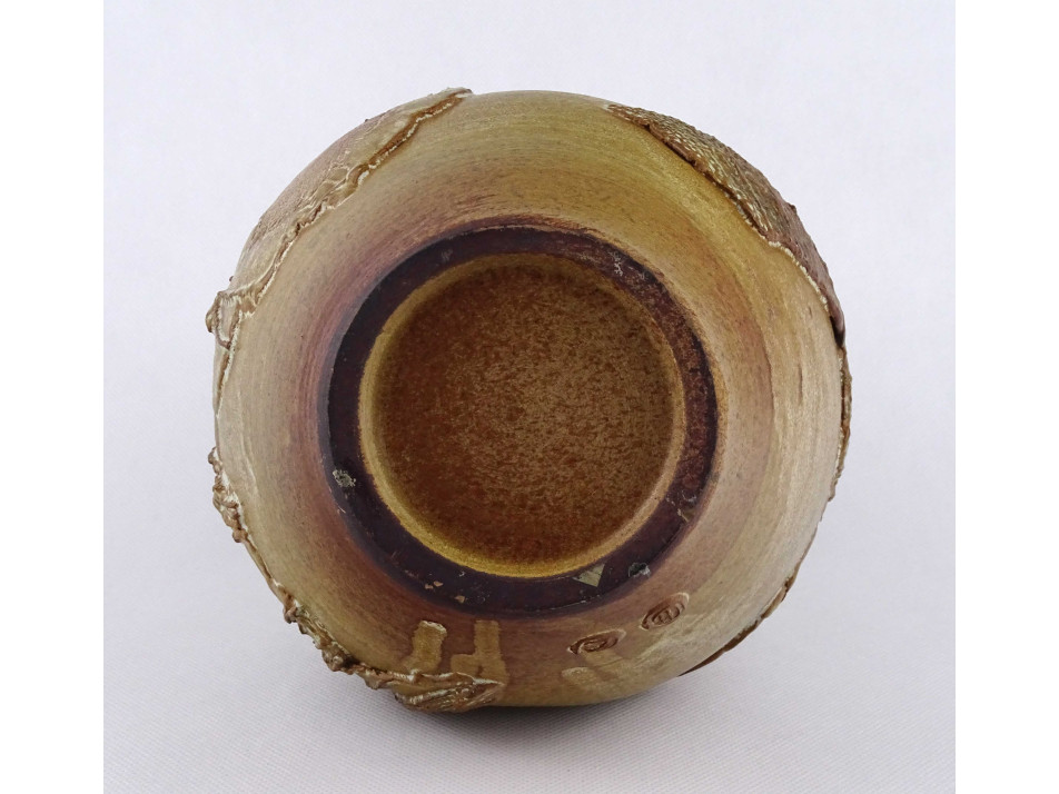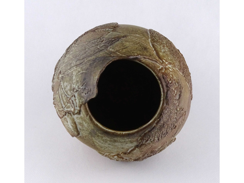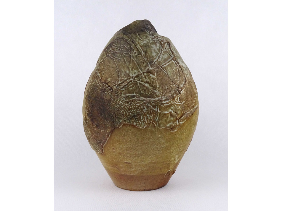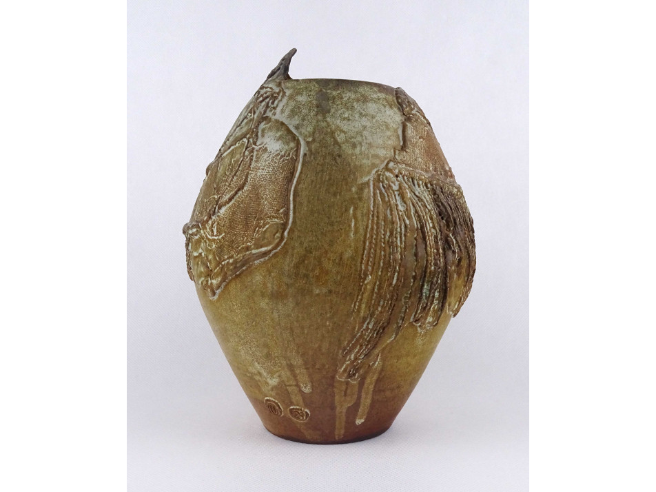 Hibátlan állapotú, barna színű mázas aplikációs technikával készült, plasztikus textílszövet mintázatokkal díszített G. Heller Zsuzsa kerámia váza. Iparművészeti kerámia.