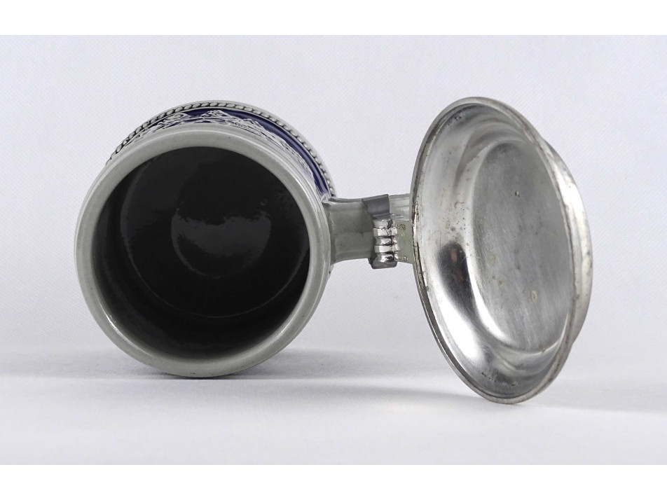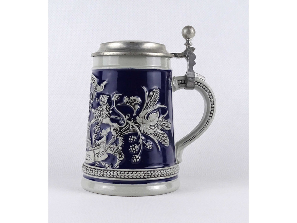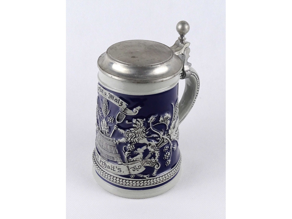 Hibátlan állapotú, ónfedeles jelzett kerámia söröskorsó, rajta oroszlános domború díszítések, kék festett alapon.