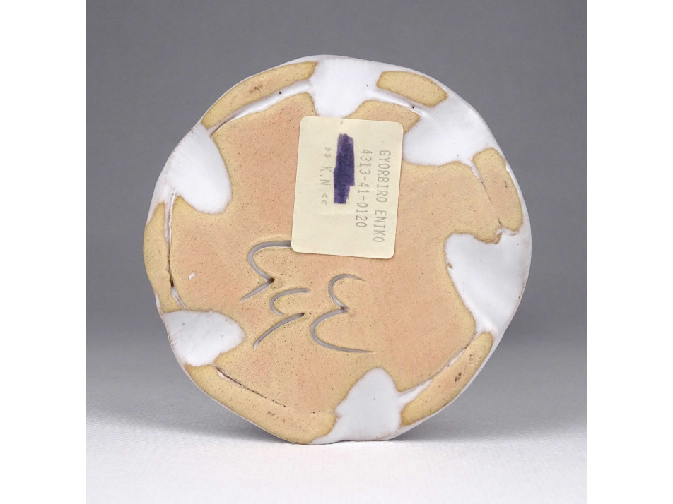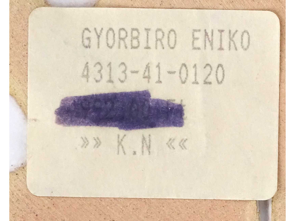 Szép állapotú, jelzett Győrbíró Enikő kerámia figura. Fiatal lány, kisasszony kalapban, csokrokkal. Szoknyája peremén egy apró lepattanás látható. Talpán karcolt jelzés: GYE Mellette gyártói papír címke.