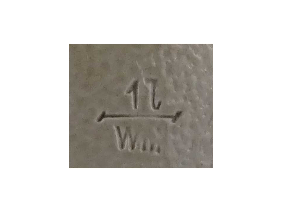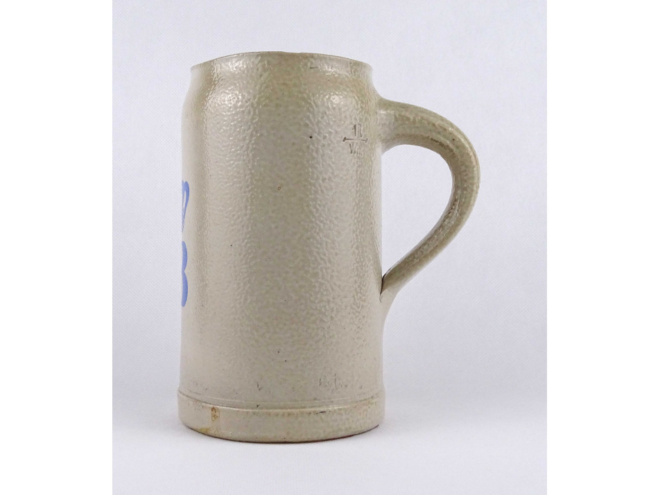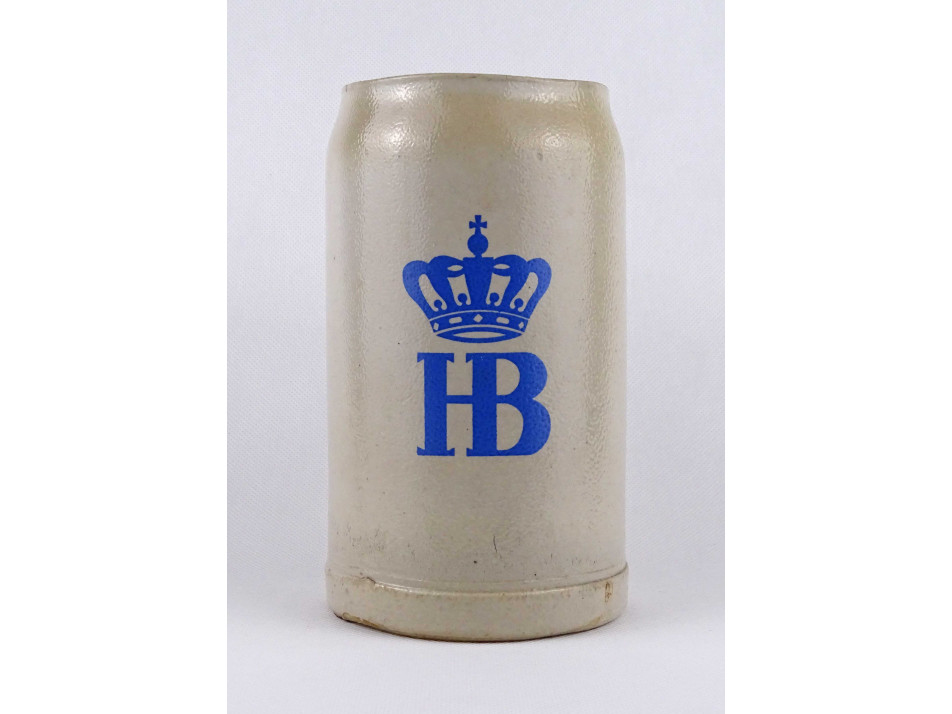 Antik, nagyméretű, kőcserép sörös kupa, krigli, rajta koronás HB díszítés. Kívülről az anyagba karcolt 1 literes jelzés.