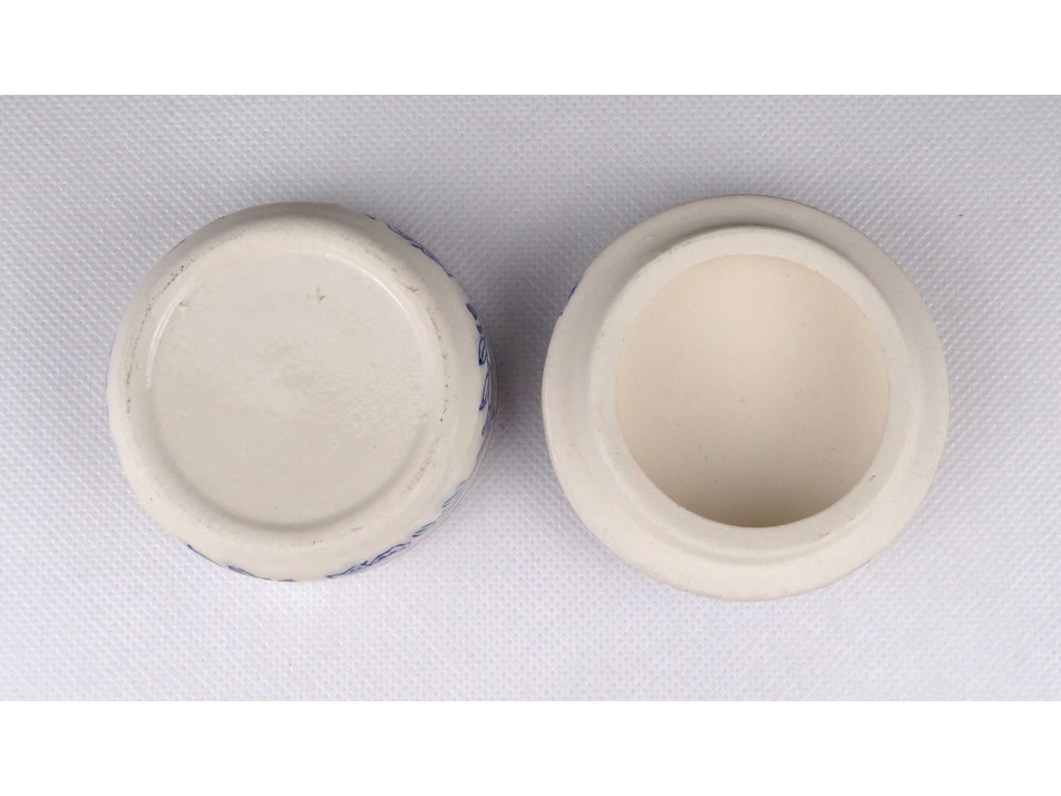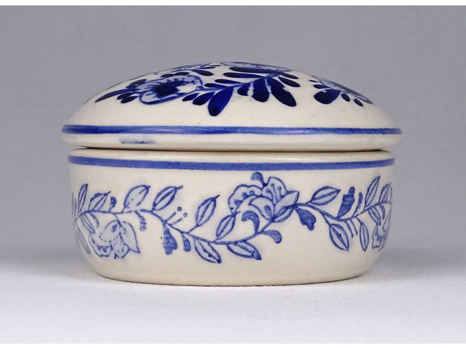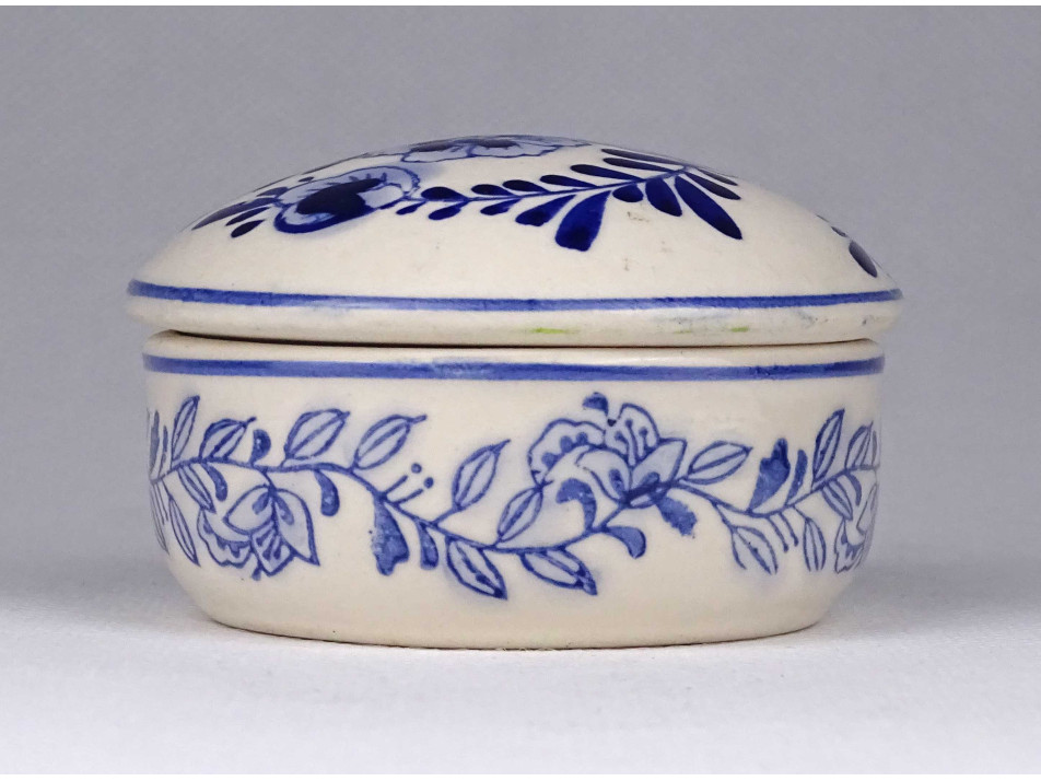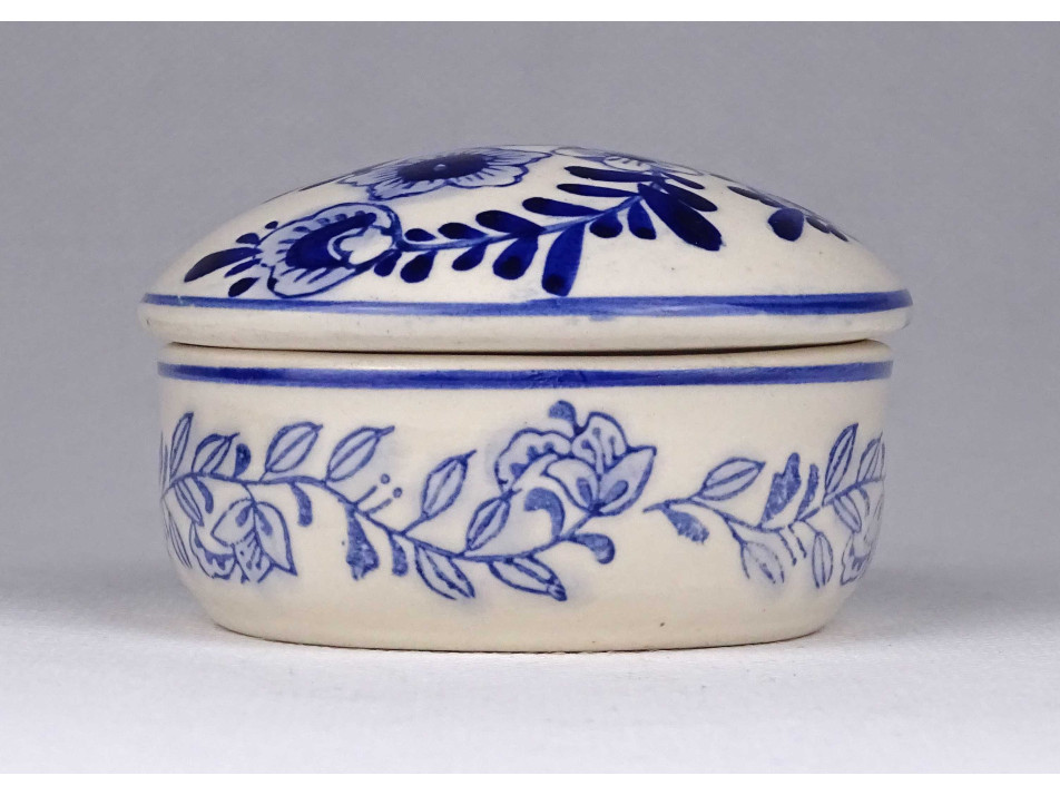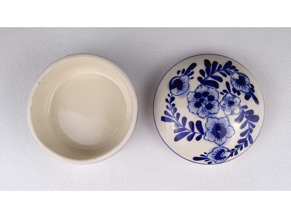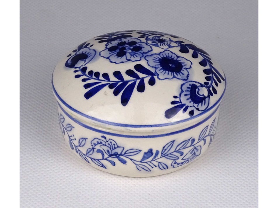 Régi, jelzetlen, kék-fehér mázas, delft jellegű virágmintás kerámia bonbonier.