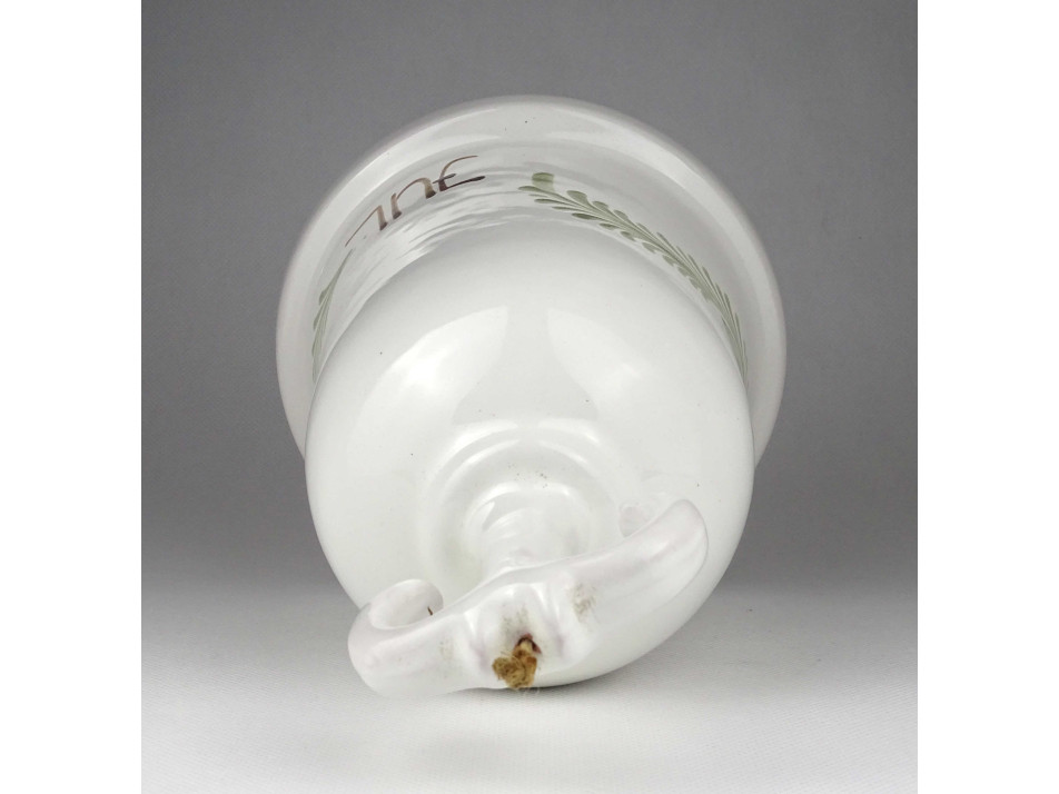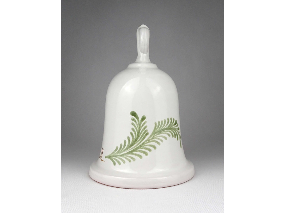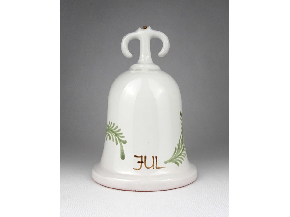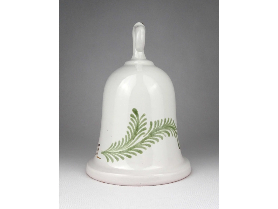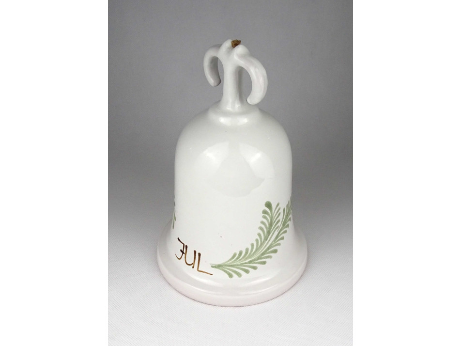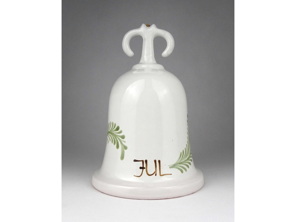 Hibátlan állapotú, jelzetlen, nagyméretű karácsonyi kerámia csengő, csengettyű. Oldalán fenyőág díszítés és JUL felirat látható. A JUL a skandinán nyelveken a karácsonyt jelenti.