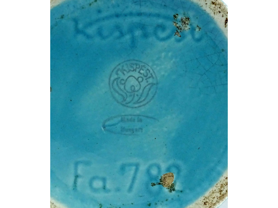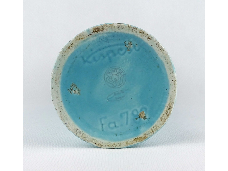 Hibátlan állapotú, jelzett, türkiz színű, mázas Kispesti kerámia váza a XX. század első feléből.