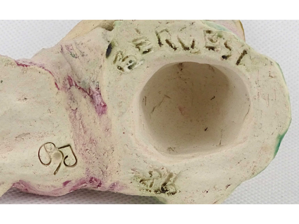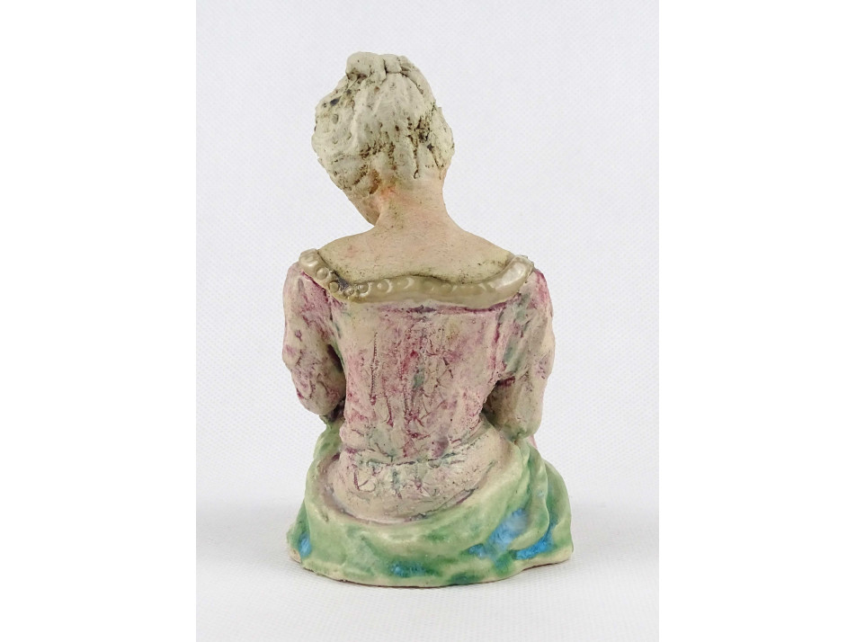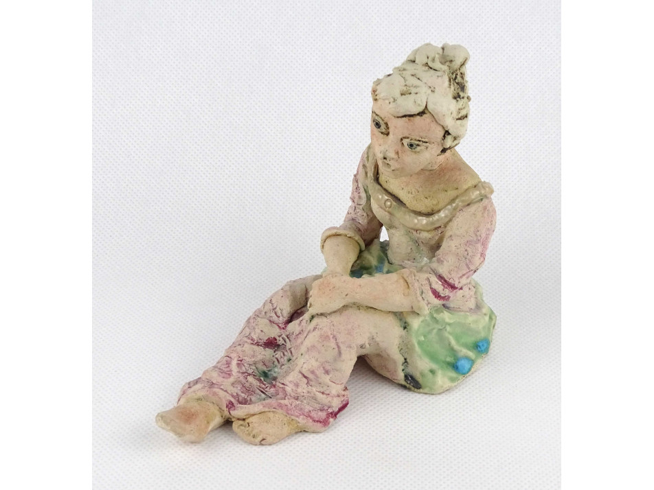 Hibátlan állapotú, máz nélküli, festett, jelzett, földön ülő fiatal nőt ábrázoló kerámia figura. Alján karcolt jelzés: BJ BÉRCESI 86