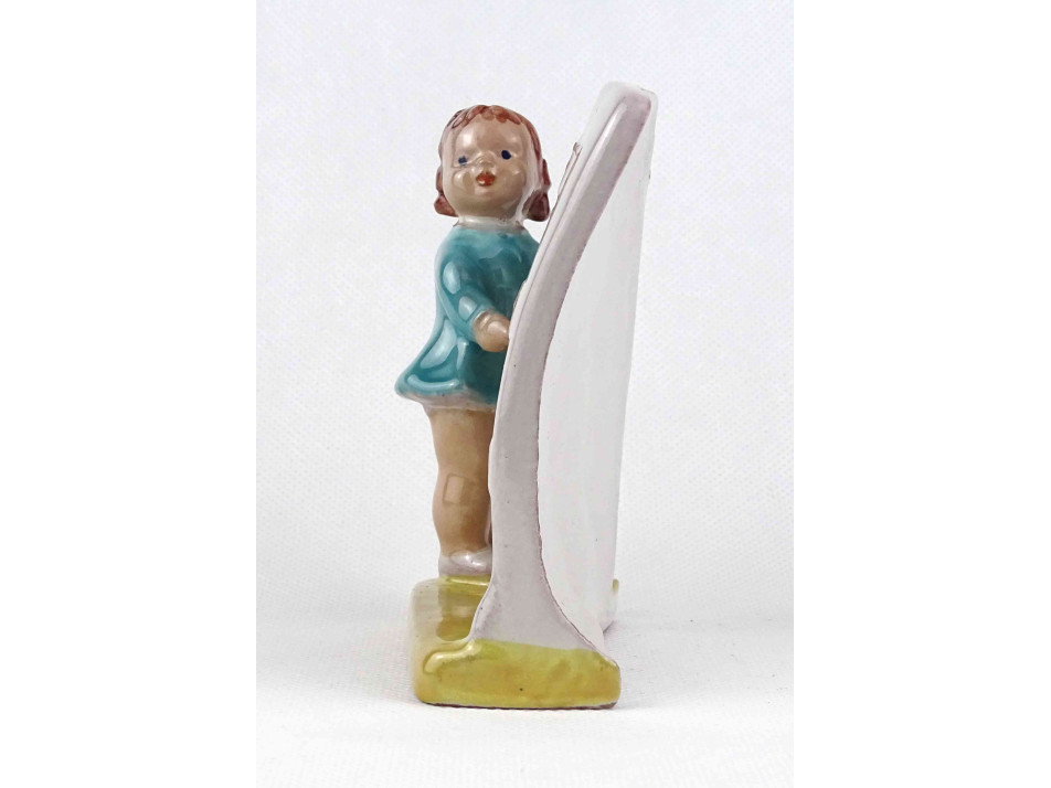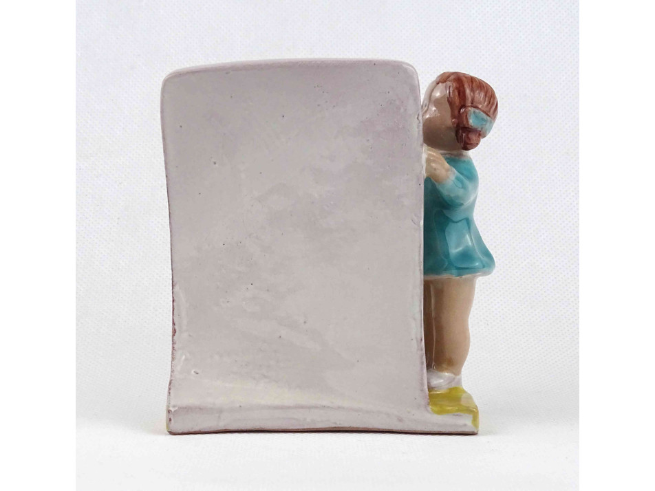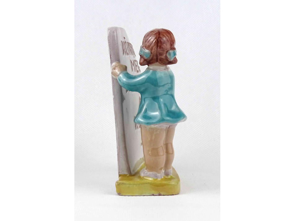 Hibátlan állapotú, talapzaton álló, feliratot tartó kerámia kislány figura. Felirat: KÖNYVET MÉG NEKED SEM ADOK KÖLCSÖN