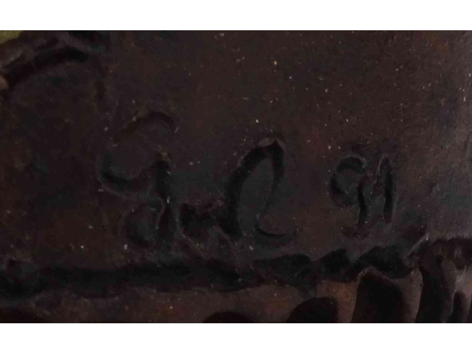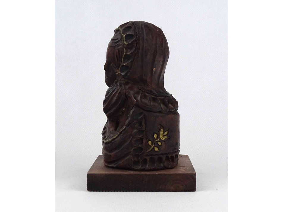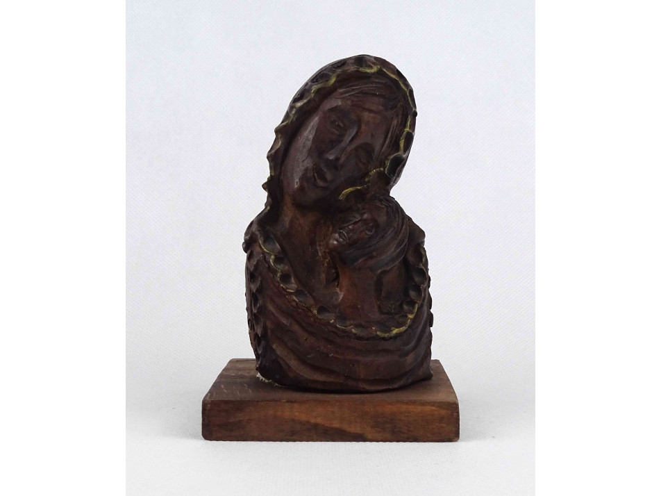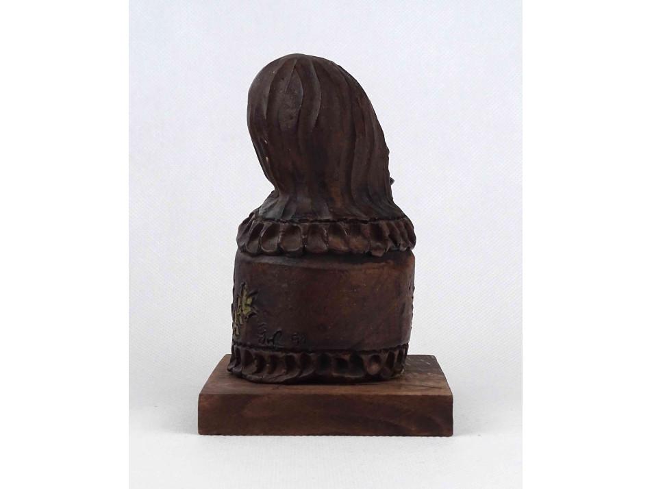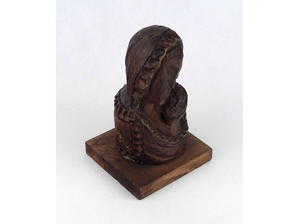Hibátlan állapotú, kis méretű, máz nélküli, Gáti Mariann kerámia figura, fejkendős nőalak gyermekével. Madonna büszt, fa talapzaton.