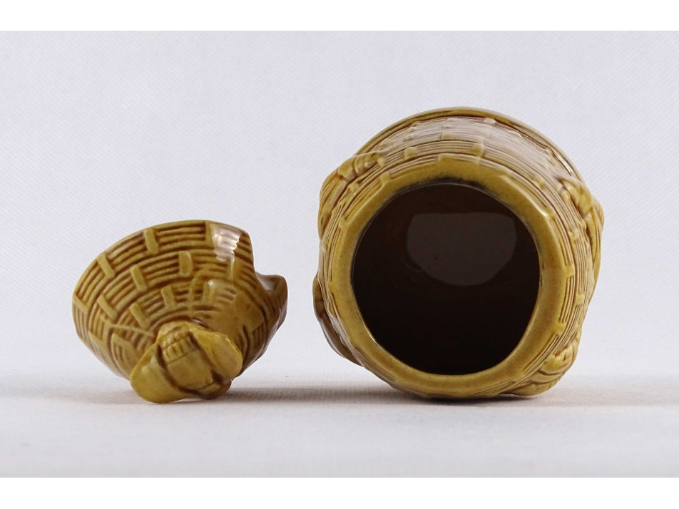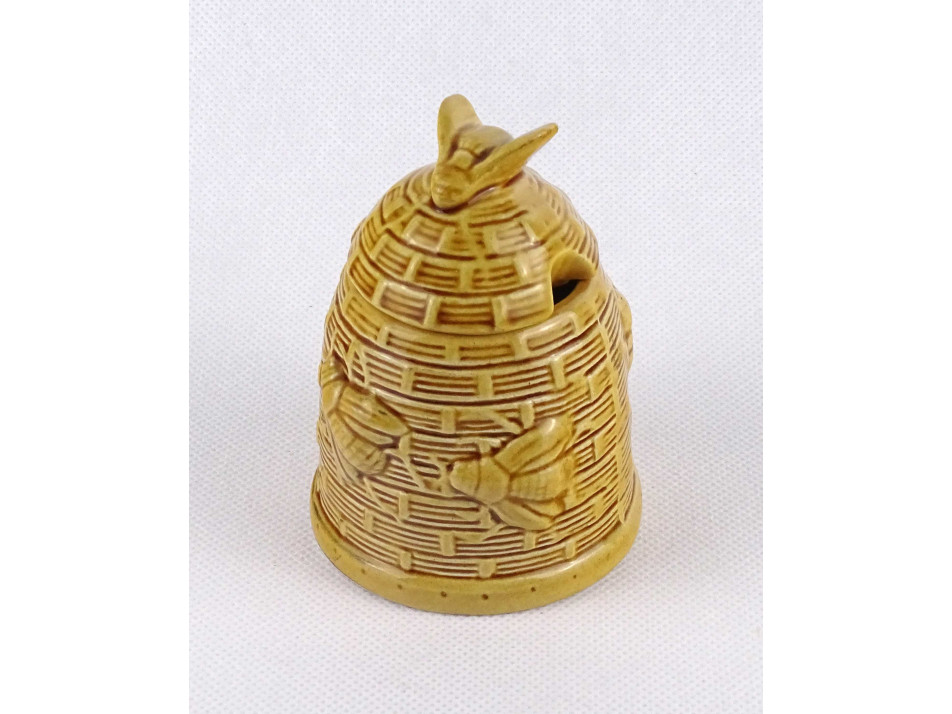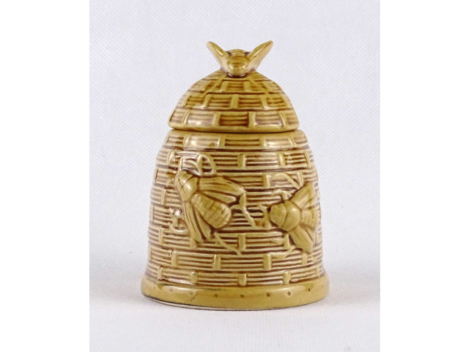 Régi, hibátlan állapotú, jelzetlen méhkaptárt mintázó fedeles kerámia mézes csupor. A csupor fedelén és oldalán plasztikusan kidomborodó méh figurák találhatóak.