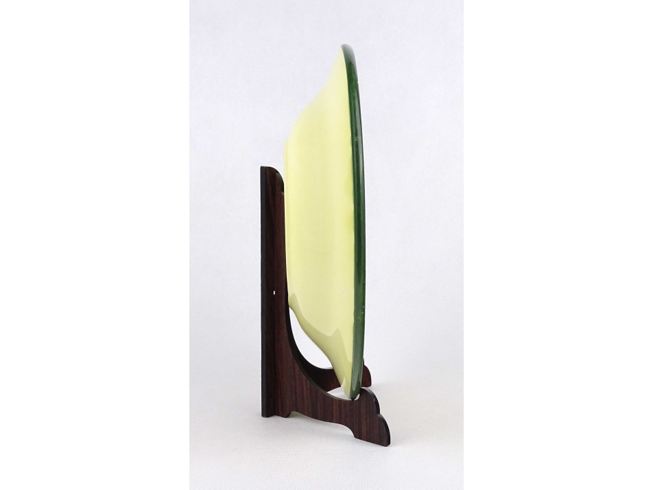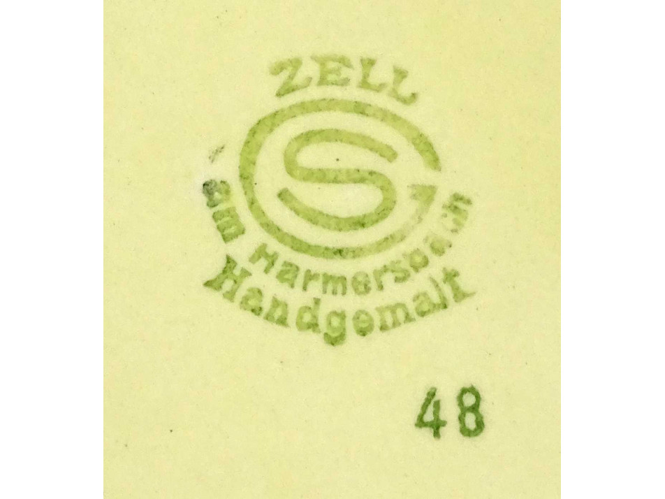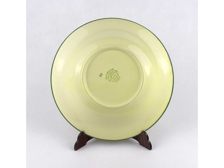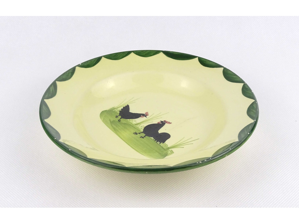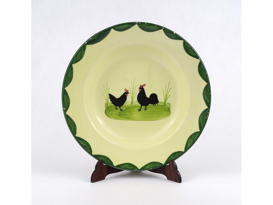Szép állapotú, vajszínű, mázas, kakasos mintával díszített, német kerámia dísztányér. Peremén több apró lepattanás látható.