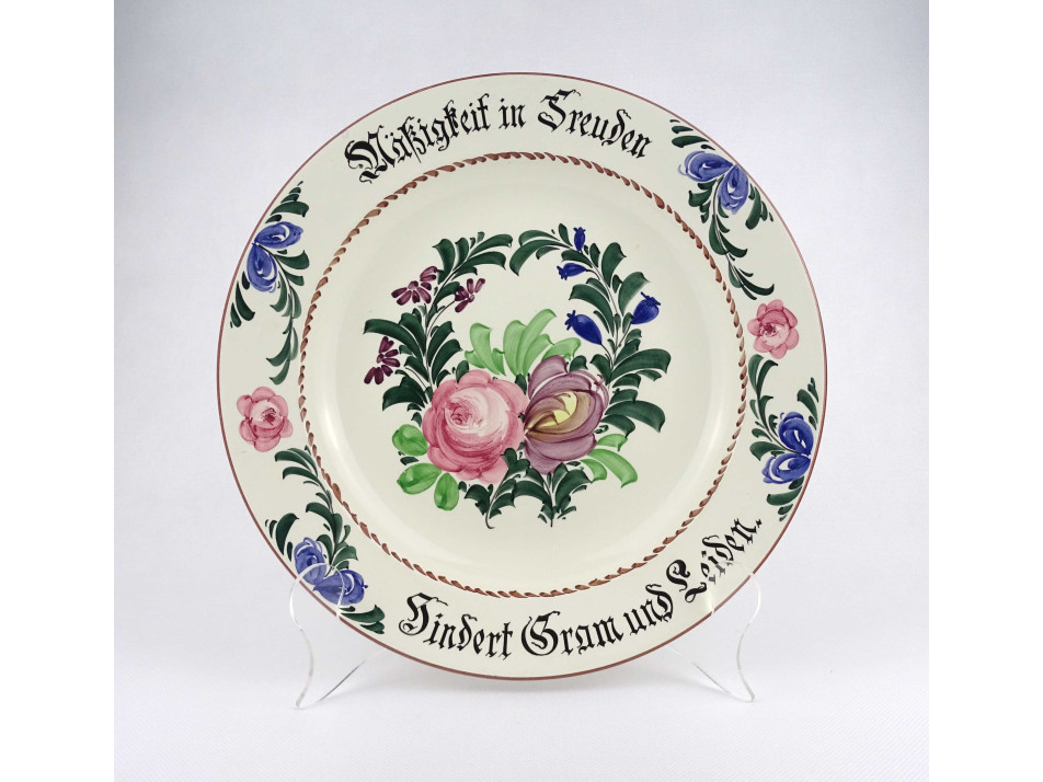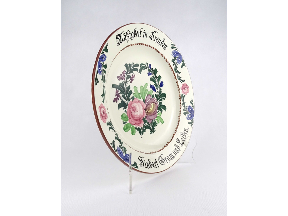 Régi, hibátlan állapotú, jelzett német Georg Schmider Zell kerámia tányér, dísztányér, fali tányér falra akasztási lehetőséggel. Rajta virágmintás díszítés és gótbetűs német felirat.