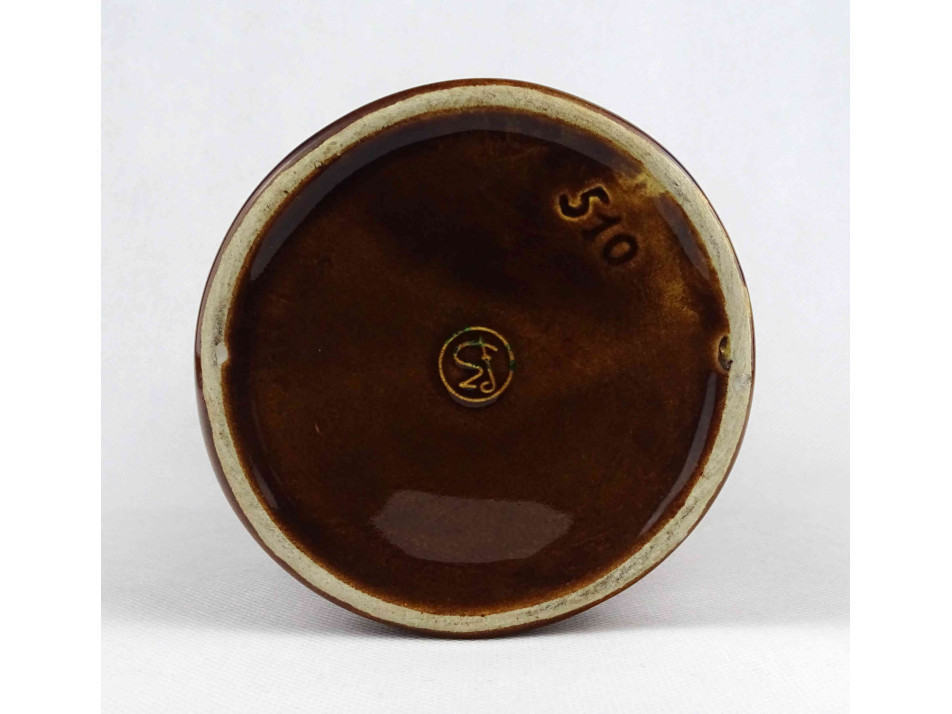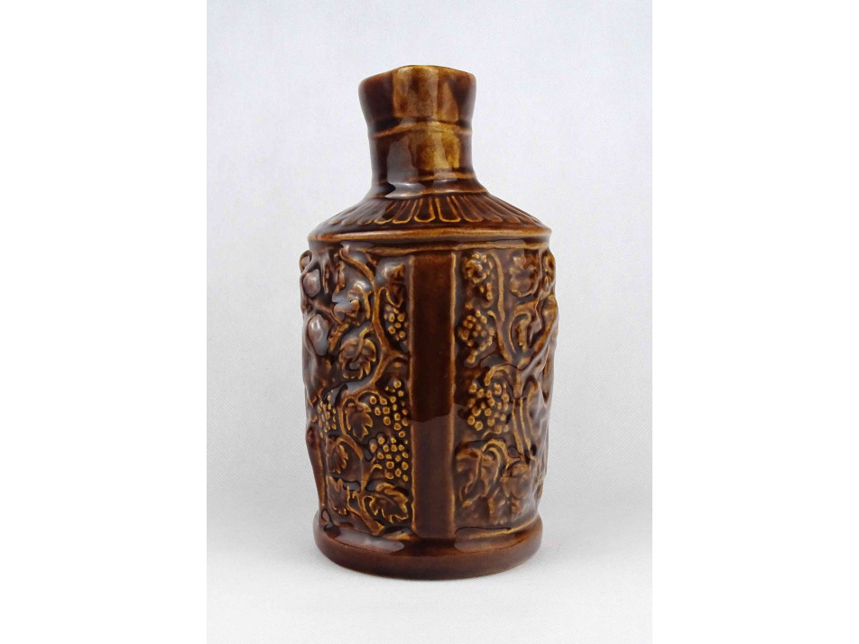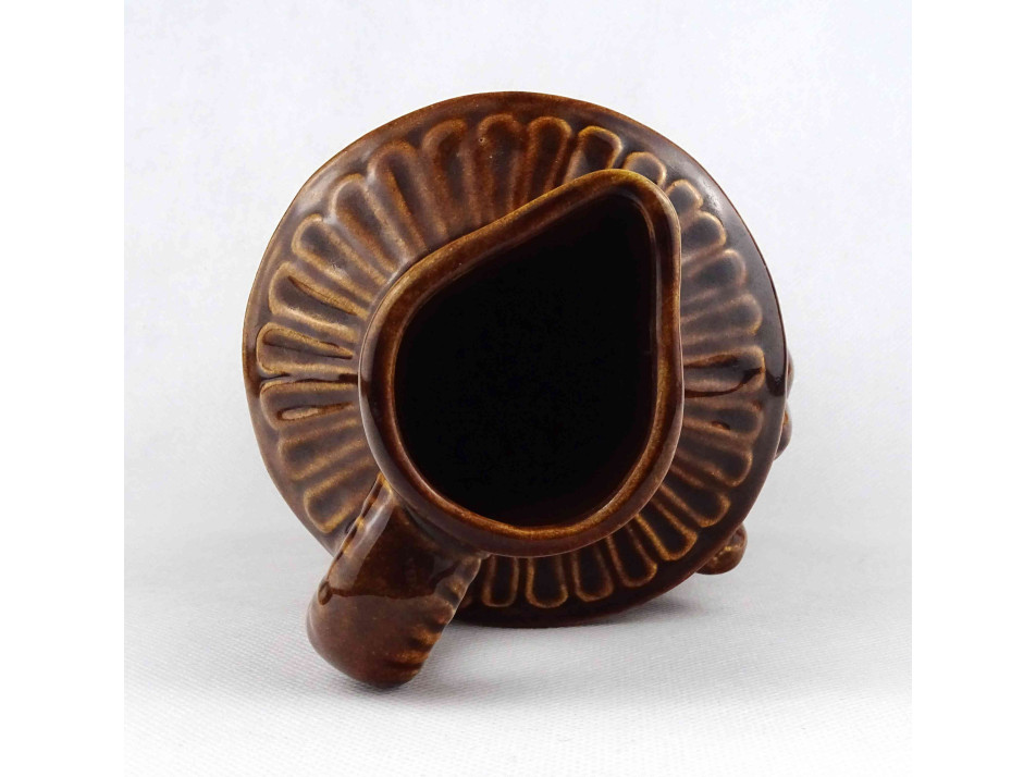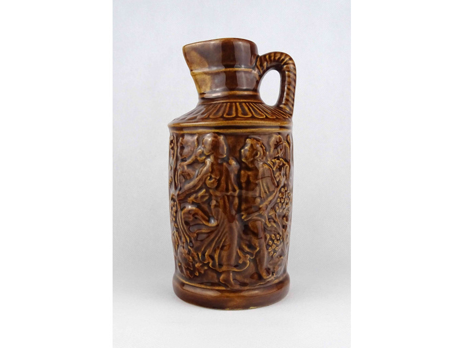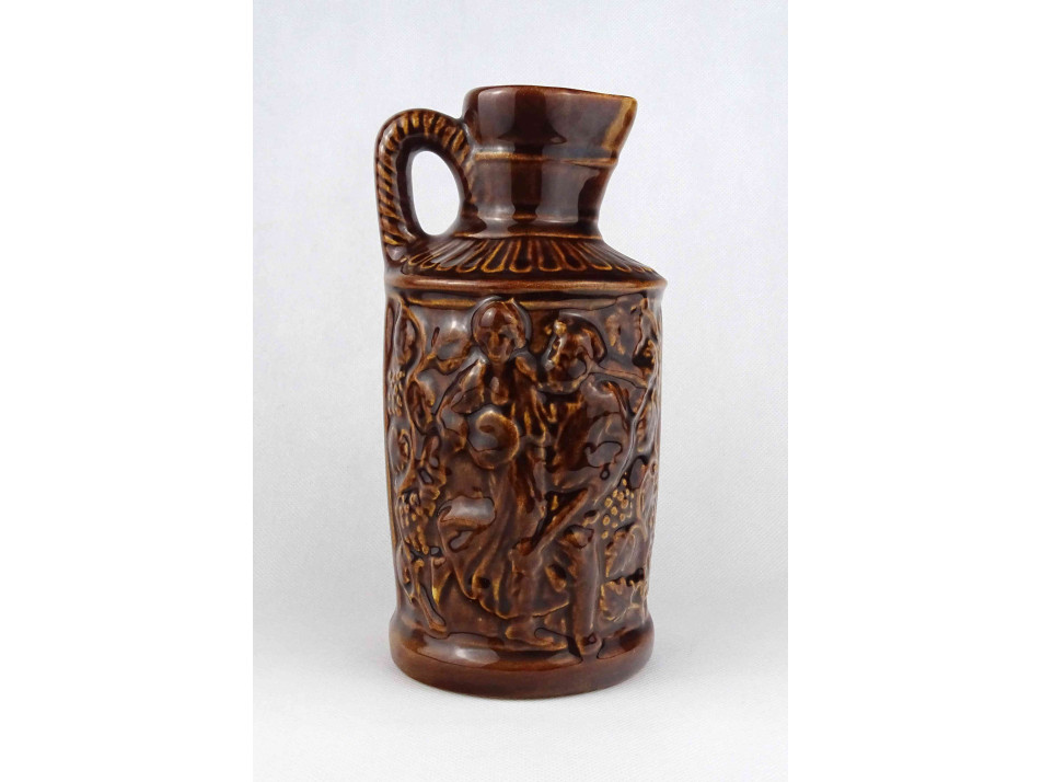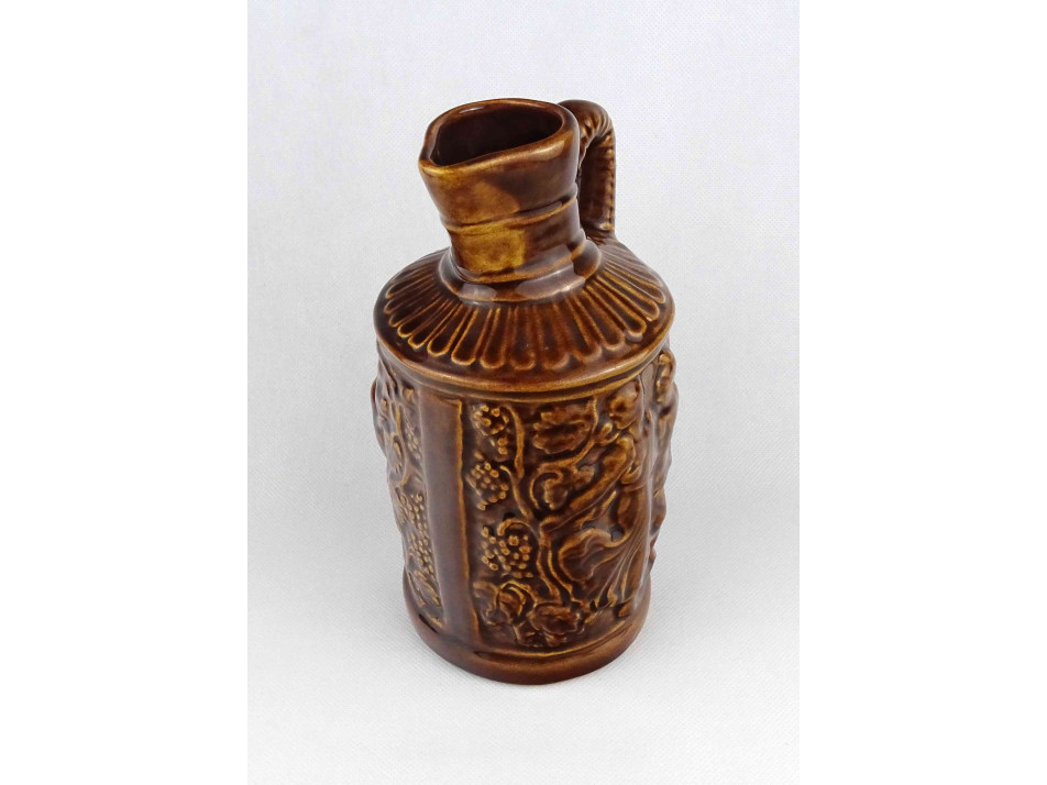 Hibátlan állapotú, barna színű mázas kerámia füles korsó, boros kancsó. Oldalán plasztikus szüreti jelenetekkel díszített.