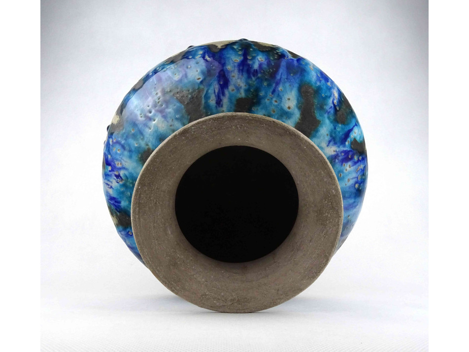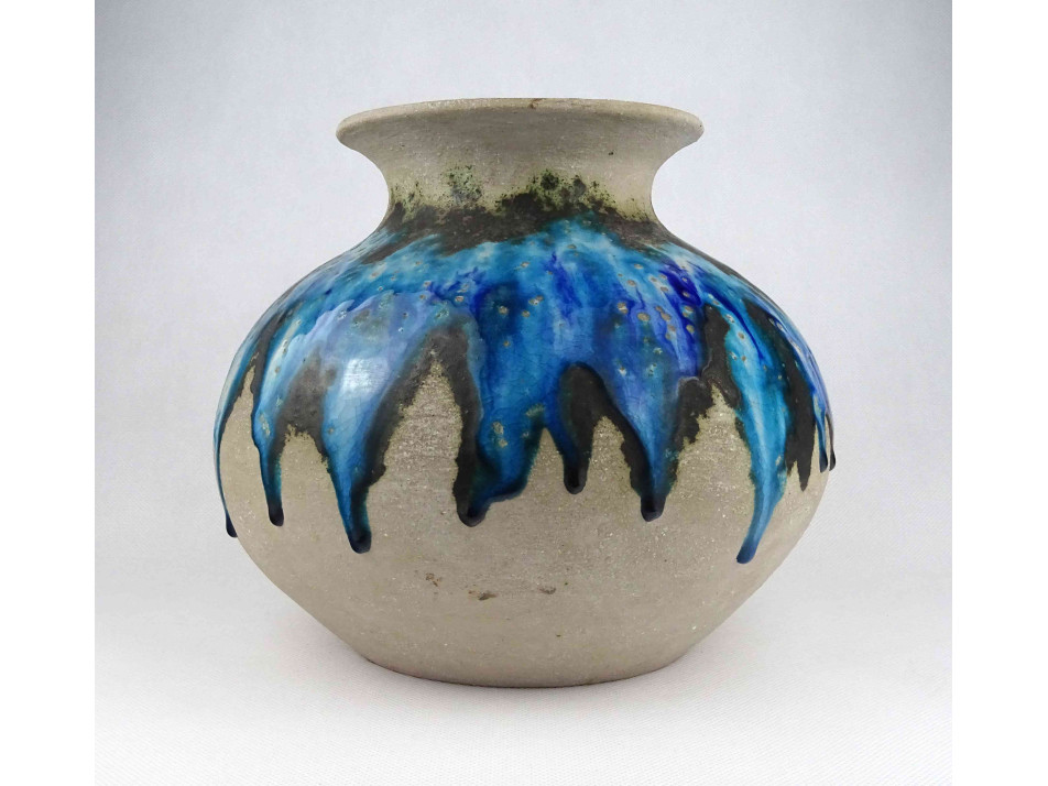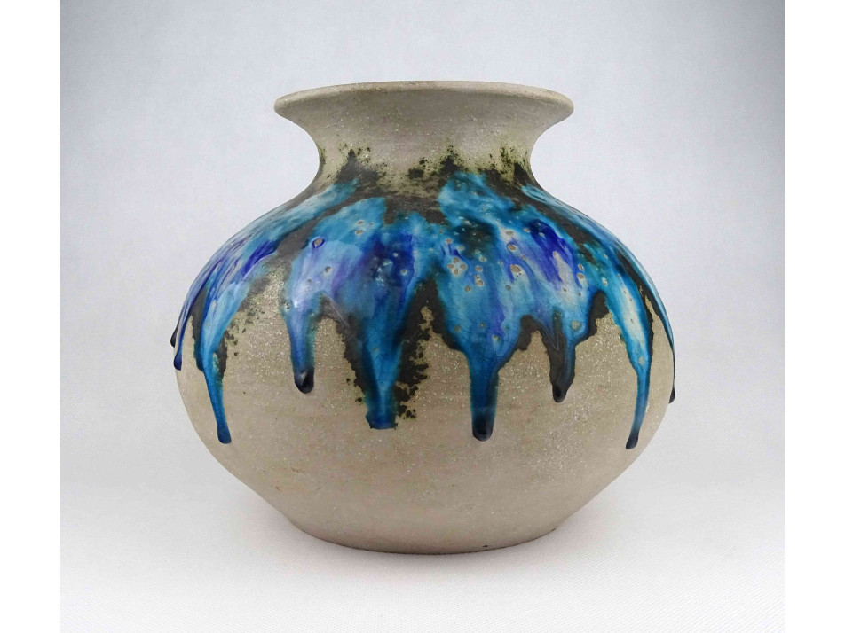 Hibátlan állapotú, jelzett Bod Éva iparművészeti tárgy, öblös, részben mázazott, kék színű mid century kerámia váza. Alján festett jelzés: BOD