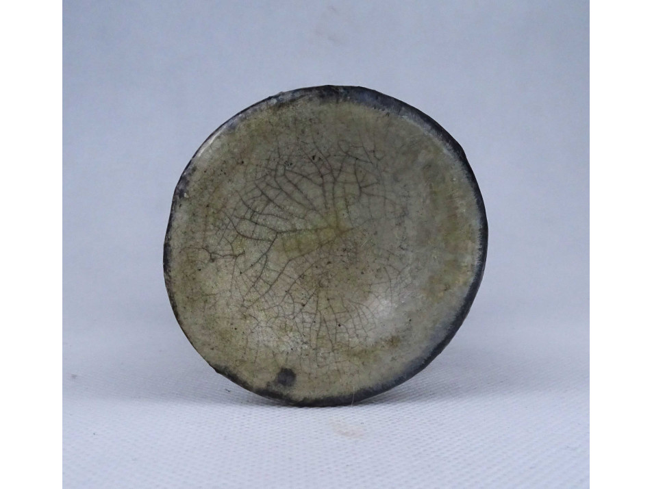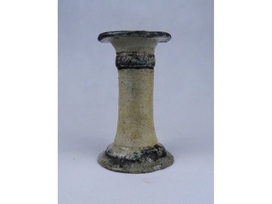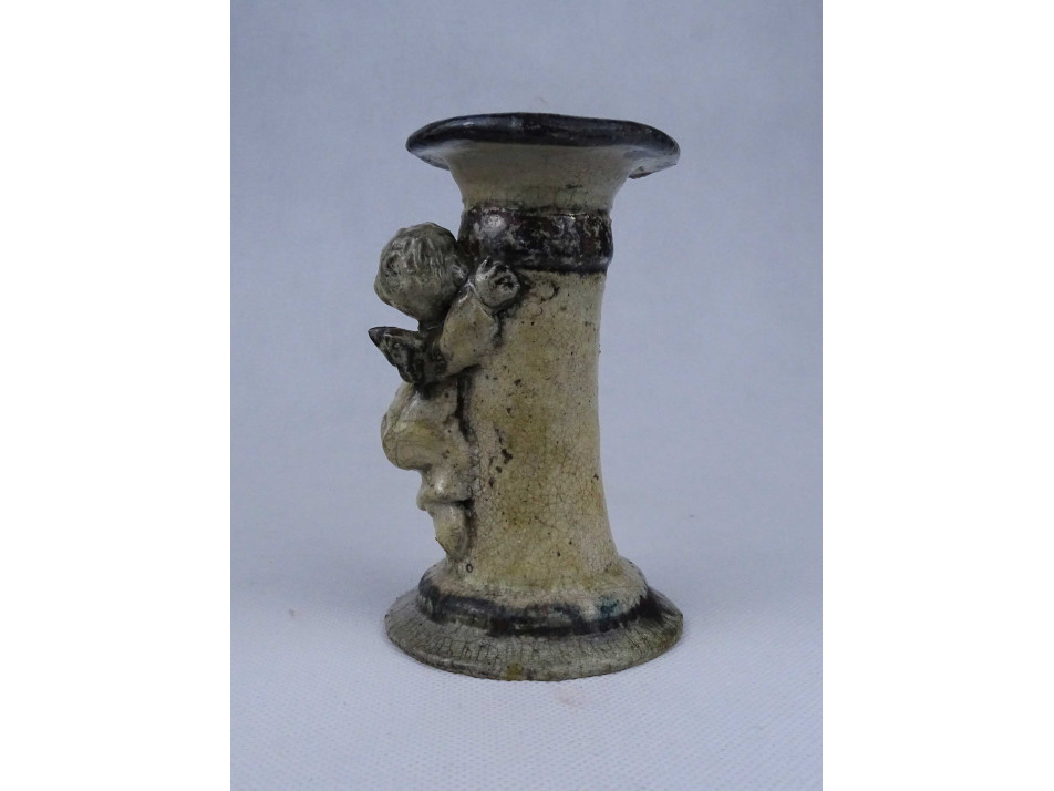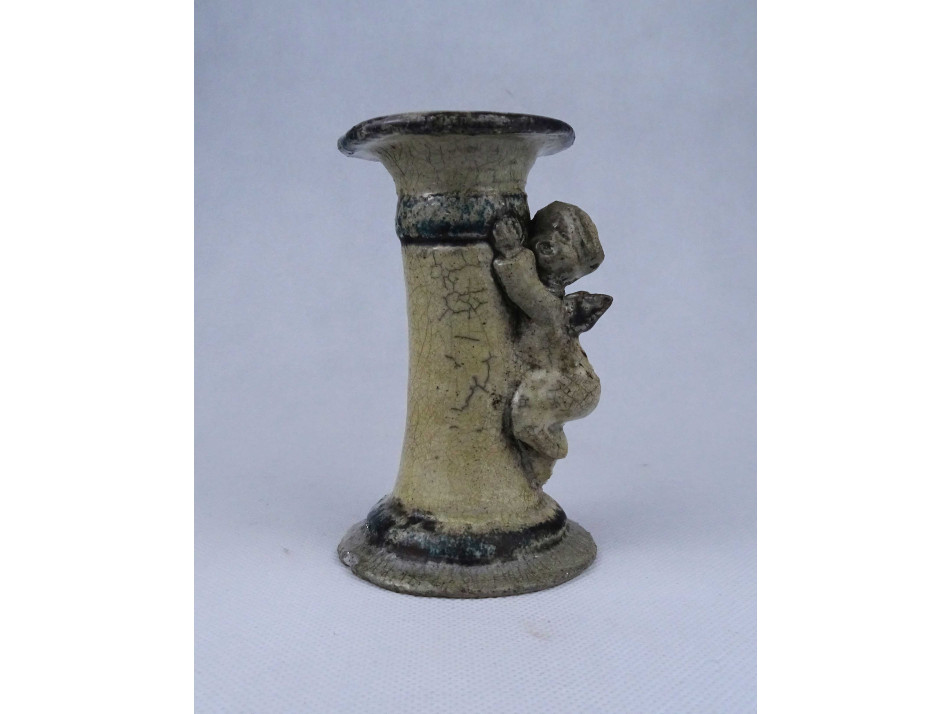 Szép állapotú, jelzetlen iparművészeti kerámia gyertyatartó, oldalán kapaszkodó plasztikus angyal figurával díszítve. Alsó peremén egy apró, alig észrevehető lepattanás látható.
