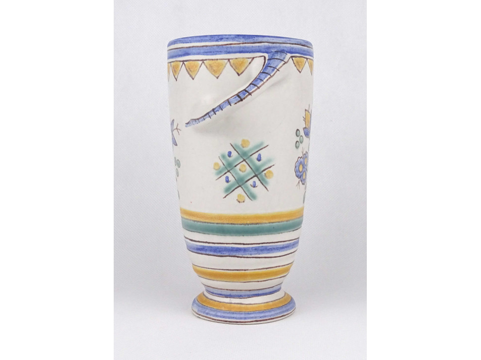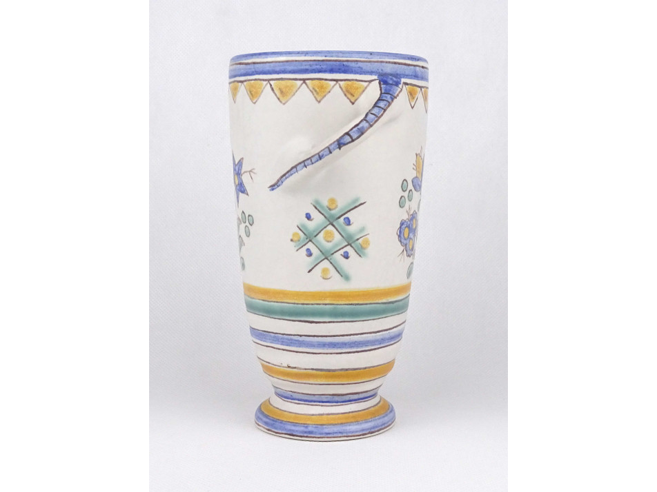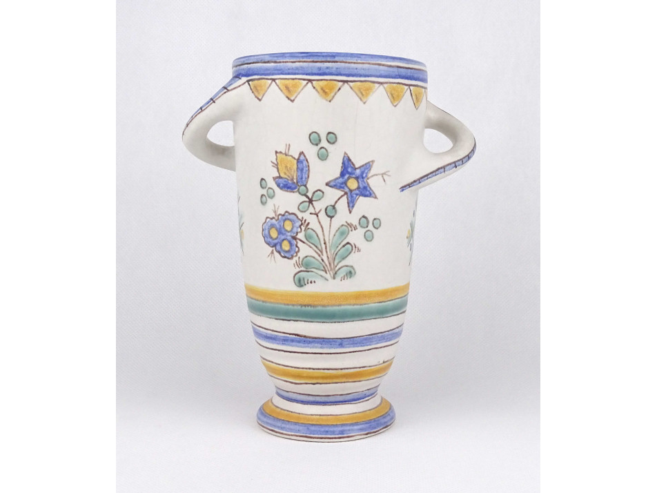 Szép állapotú, kétfülű, Iparművész Vállalatos Gorka kerámia váza, díszváza. Rajta habán jellegű kézi festett díszítések. Talpán egy apró lepattanás látható.
