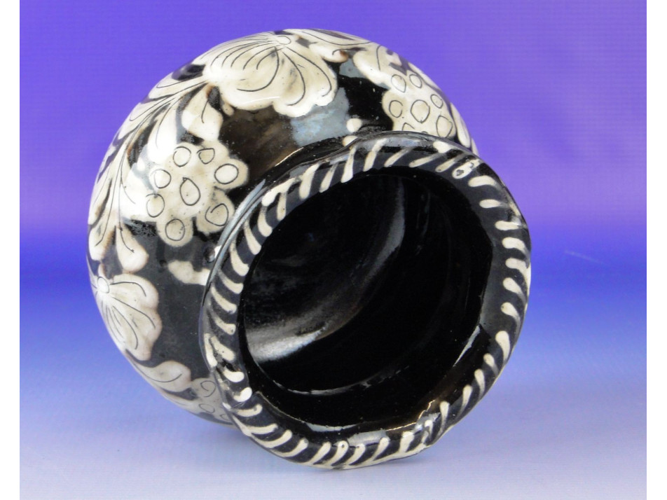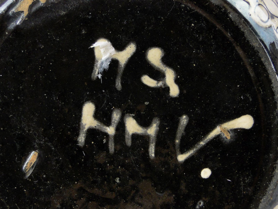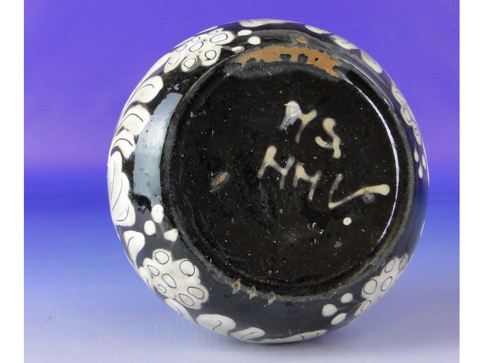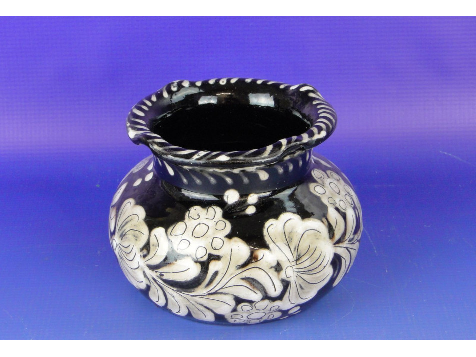 Hibátlan állapotú, kívül belül mázas, jelzett fazekas munka, körben festett virág díszítésekkel. Alján jelzés: MS HMV