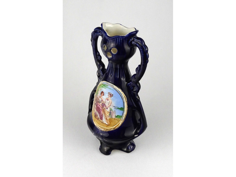 Régi, szép állapotú, kobaltkék mázas, antik, nőalakos jelenettel díszített, majolika váza.