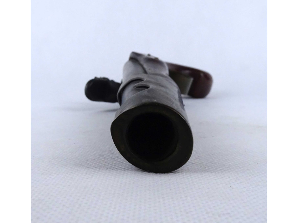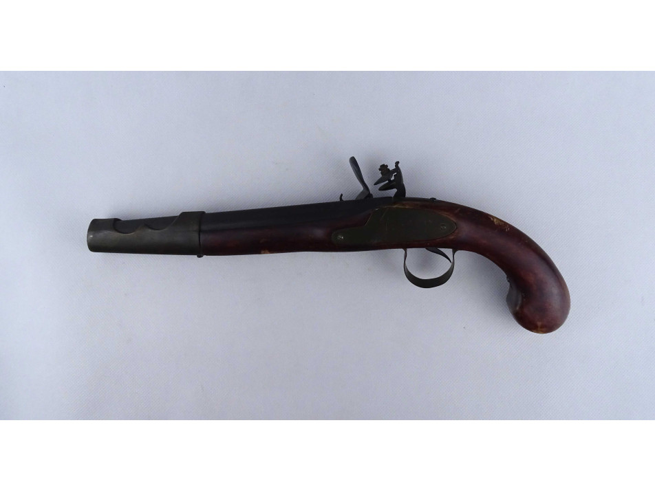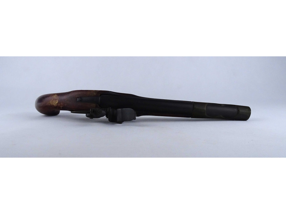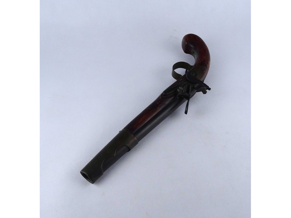 Régi, réz rátétlemezzel díszített, fa ágyazatú elöltöltős kovás pisztoly replika. Nem használható, csak dísz pisztoly. A szerkezet nem működik.