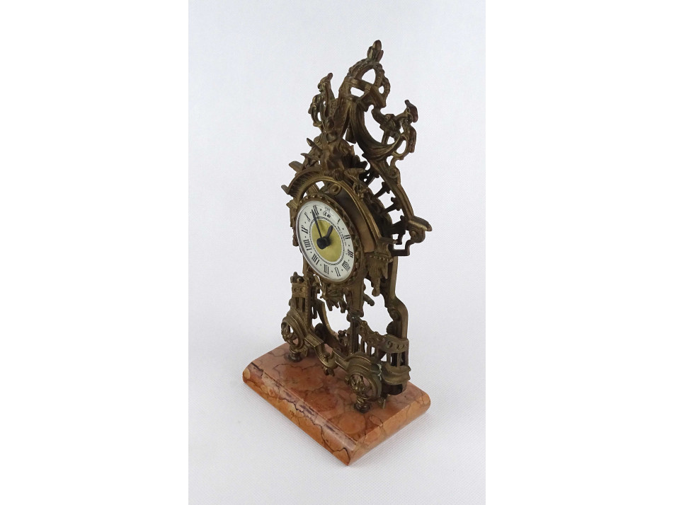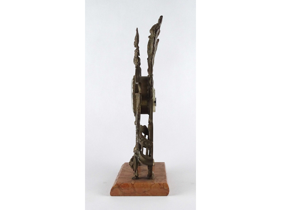 Régi, réz testű asztali óra, kandalló óra márvány talapzaton. Plasztikus barokk motívumokkal gazdagon díszített impozáns darab. Benne modern digitális óraszerkezet található. Az óra jelenleg nem működik, karbantartásra szorul.