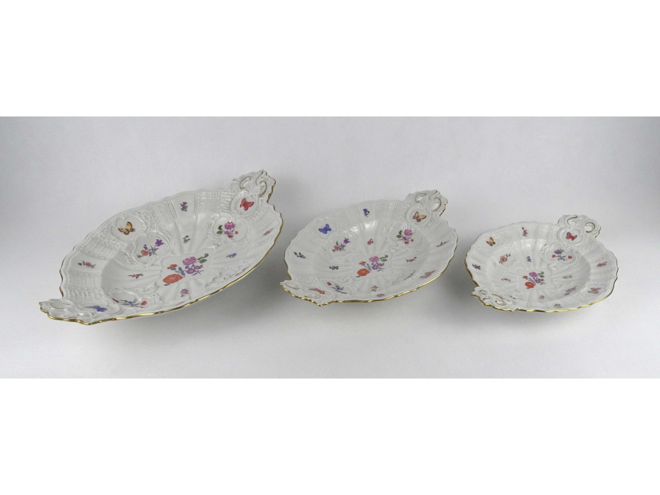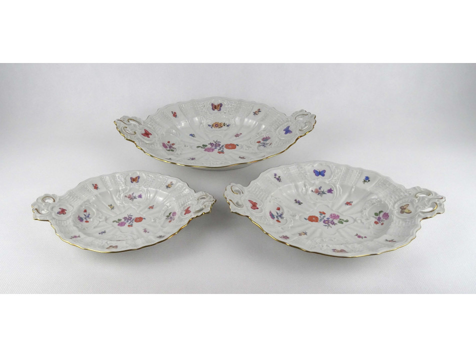 Régi, hibátlan állapotú, ovális alakú, virágokkal és pillangó mintával díszített Volkstedter Rudolstadt porcelán kínáló tál készlet, 3 darab különböző méretben.