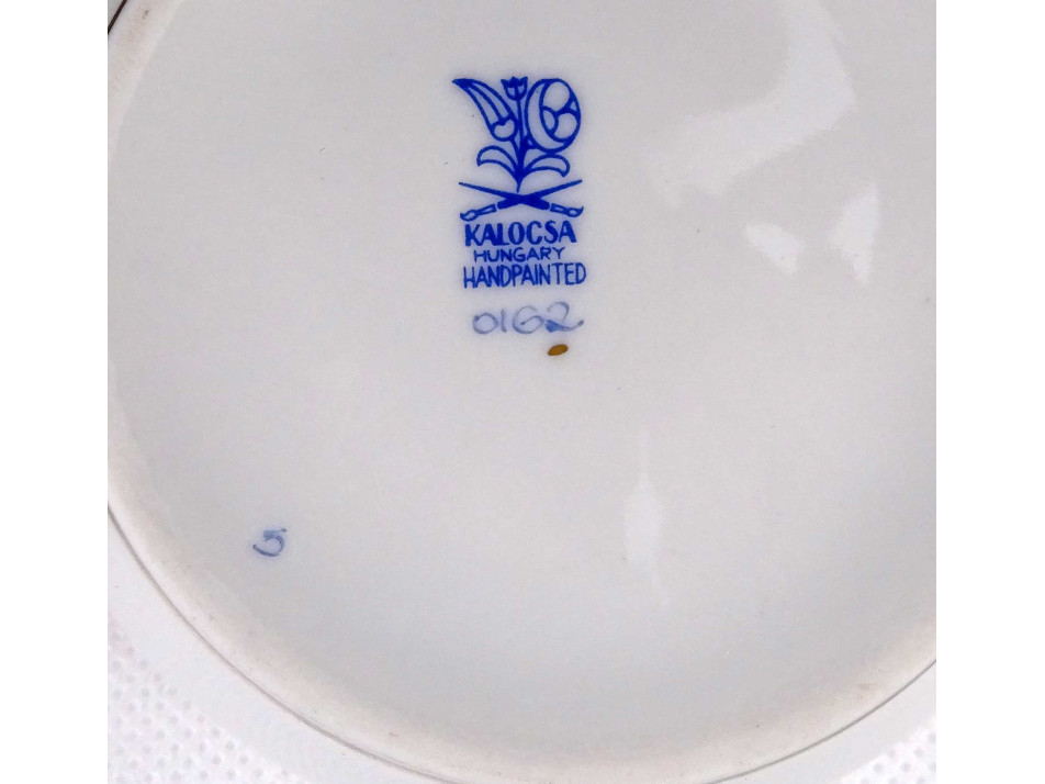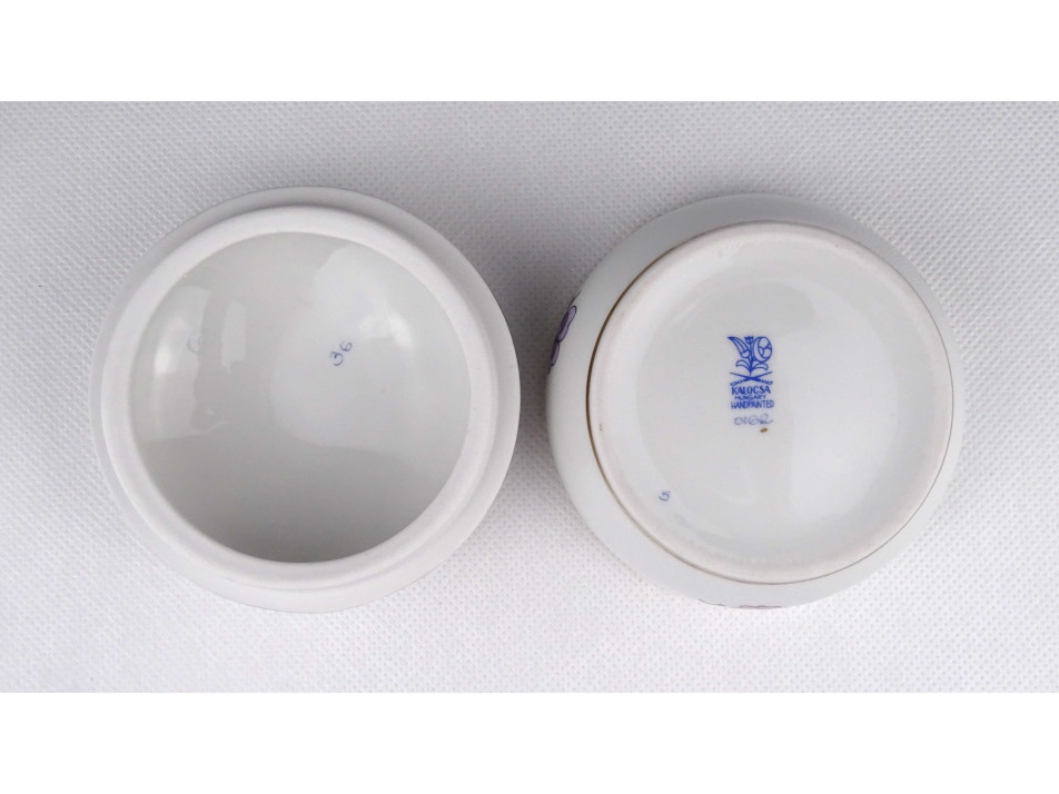 Hibátlan állapotú, szélén, körben aranyozott, tipikus kalocsai virágmotívumokkal gazdagon díszített porcelán bonbonier, gyűrűtartó, ékszertó.