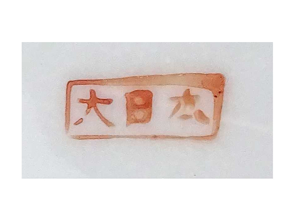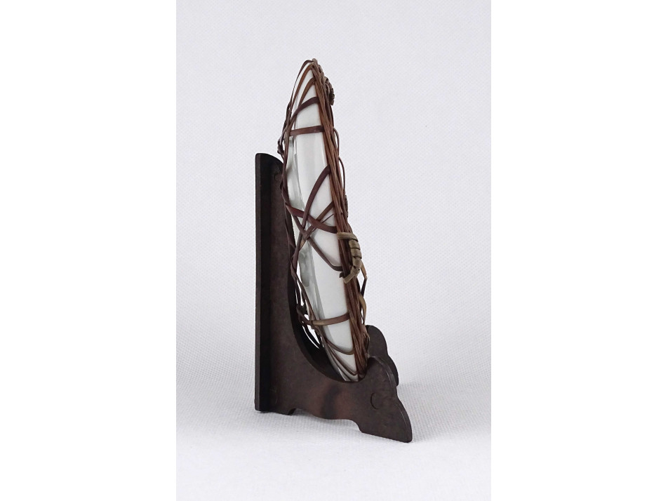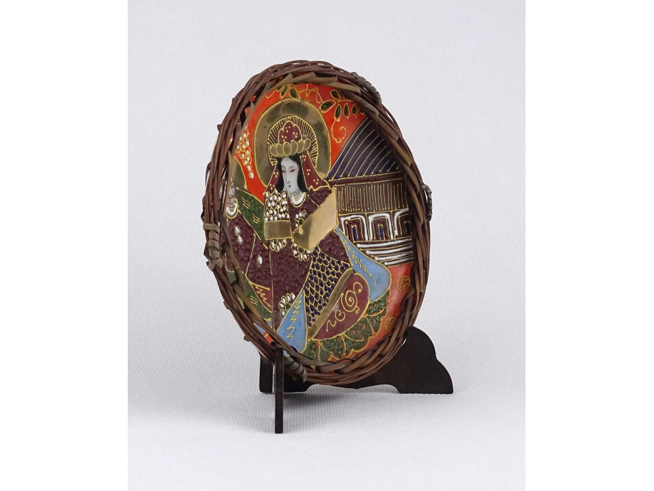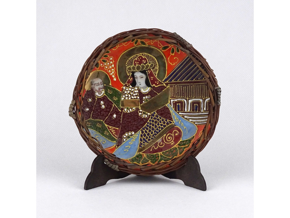 Régi japán Satsuma, kézzel festett, két alakos porcelán tányér, nádfonat keretben 13.4 cm