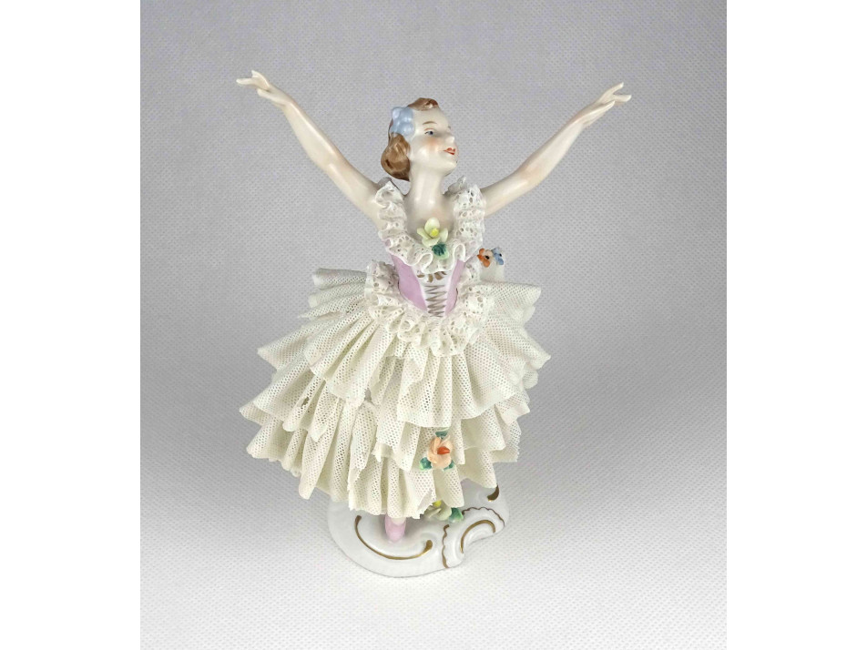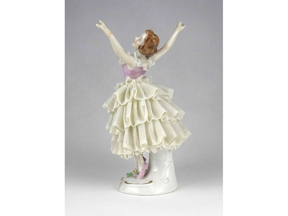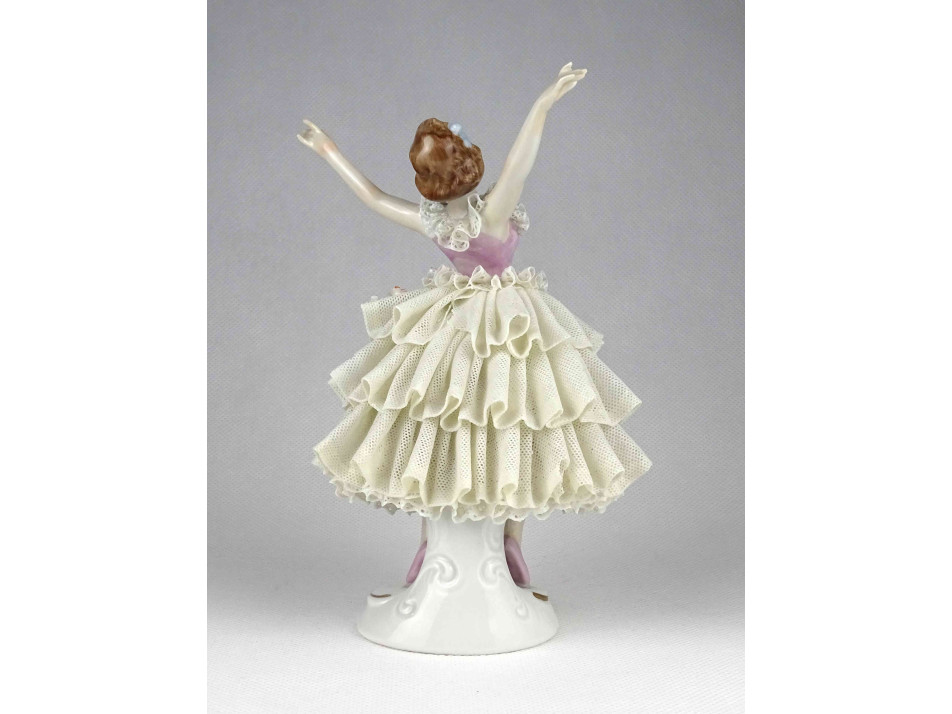 Régi, jelzett, Unterweissbach tüllszoknyás balerina porcelán figura. A szoknyán több hiba található, jobb kezének mutatóujja sérült.