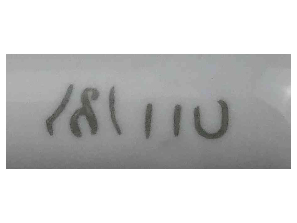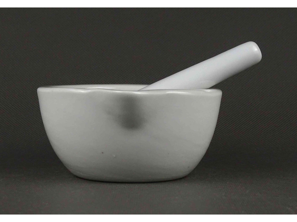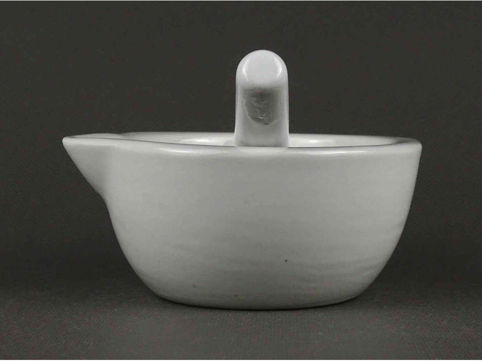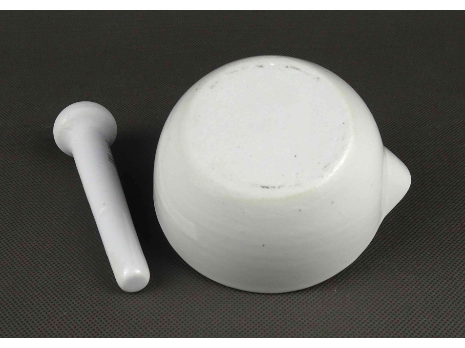 Antik, hibátlan állapotú, kisméretű, jelzett, fehér színű, porcelán mozsár törővel.