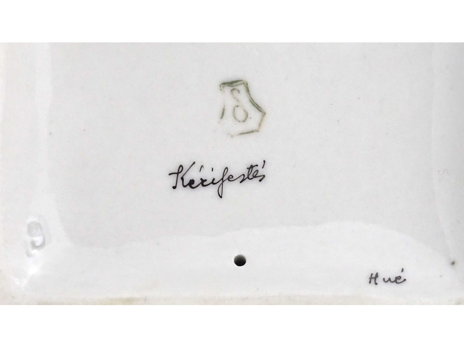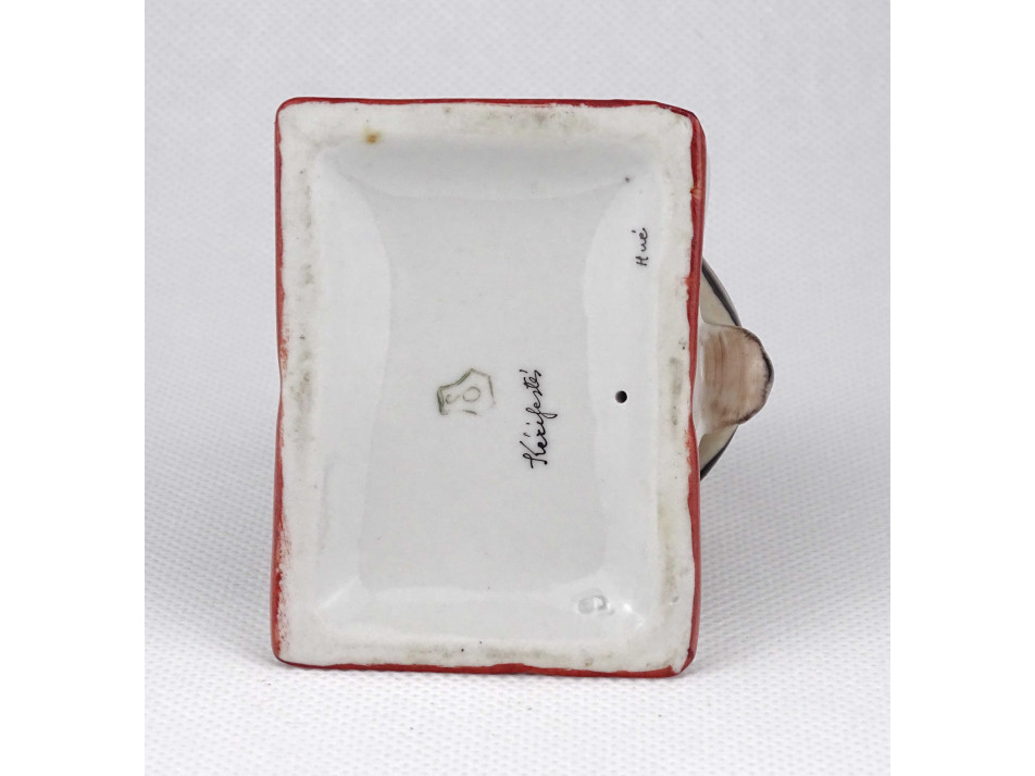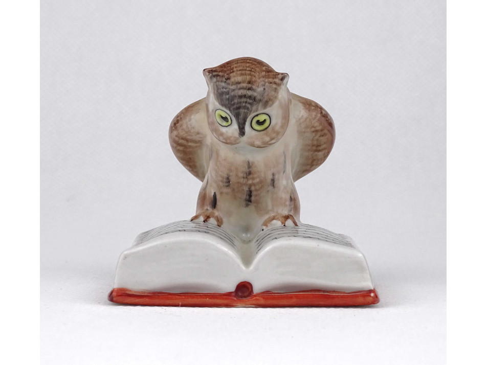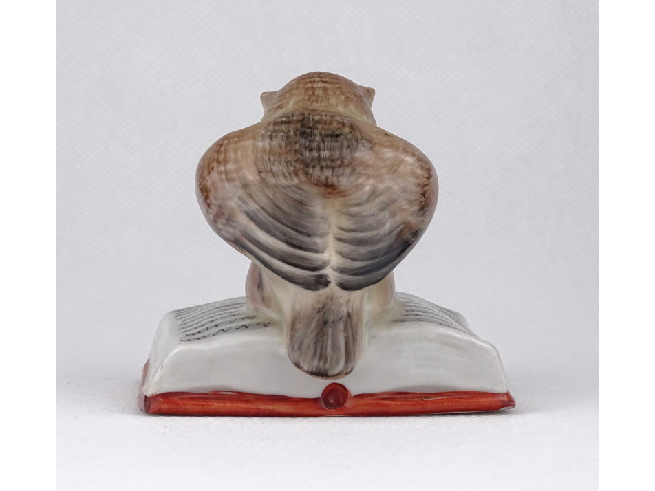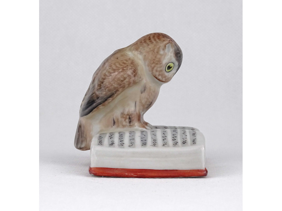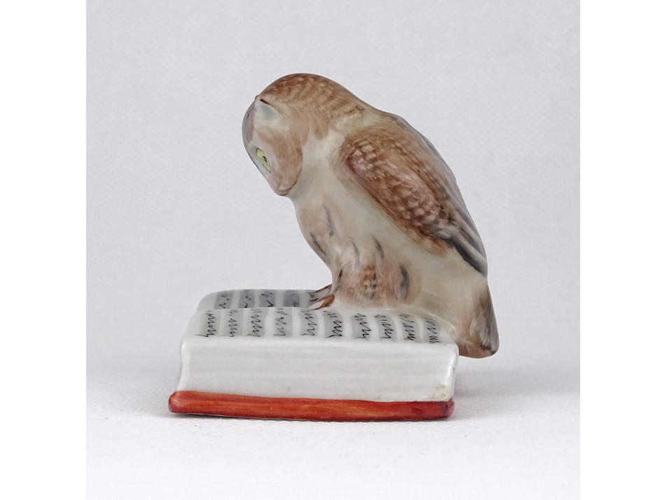 Hibátlan állapotú, kézzel festett, talapzaton álló, könyvön ülő, olvasó bagoly. Alján zöld Drasche márkajelzés, mellette felirat: KÉZIFESTÉS