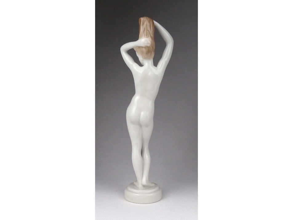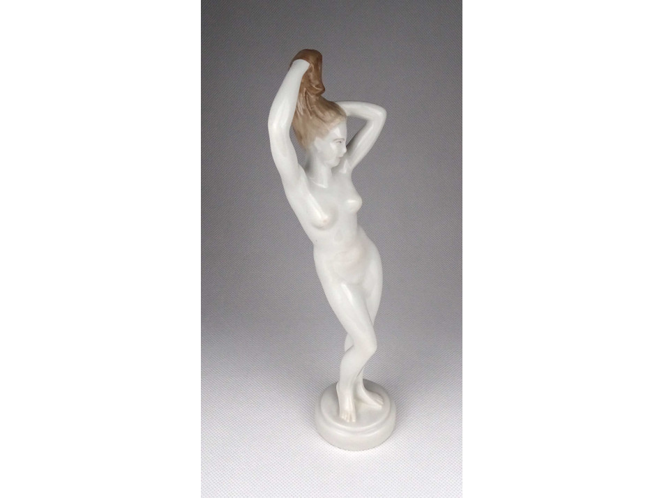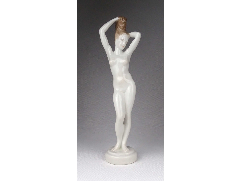 Hibátlan állapotú, egész alakos, kézi festéssel díszített Aquincum porcelán női akt szobor. Alján kék márkajelzés: BUDAPEST AQUINCUM