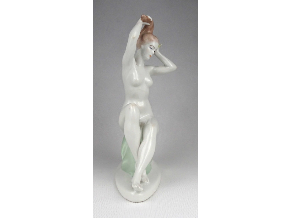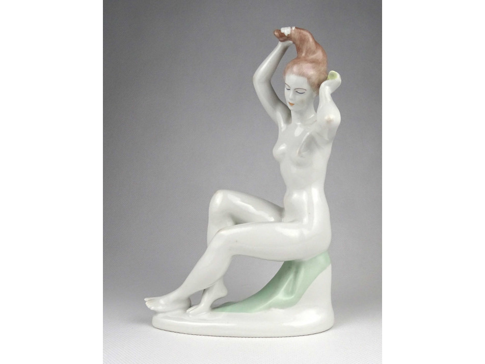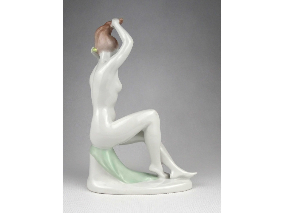 Hibátlan állapotú, porcelán ülő, fésülködő, női akt szobor. Alján kék márkajelzés: BUDAPEST AQUINCUM