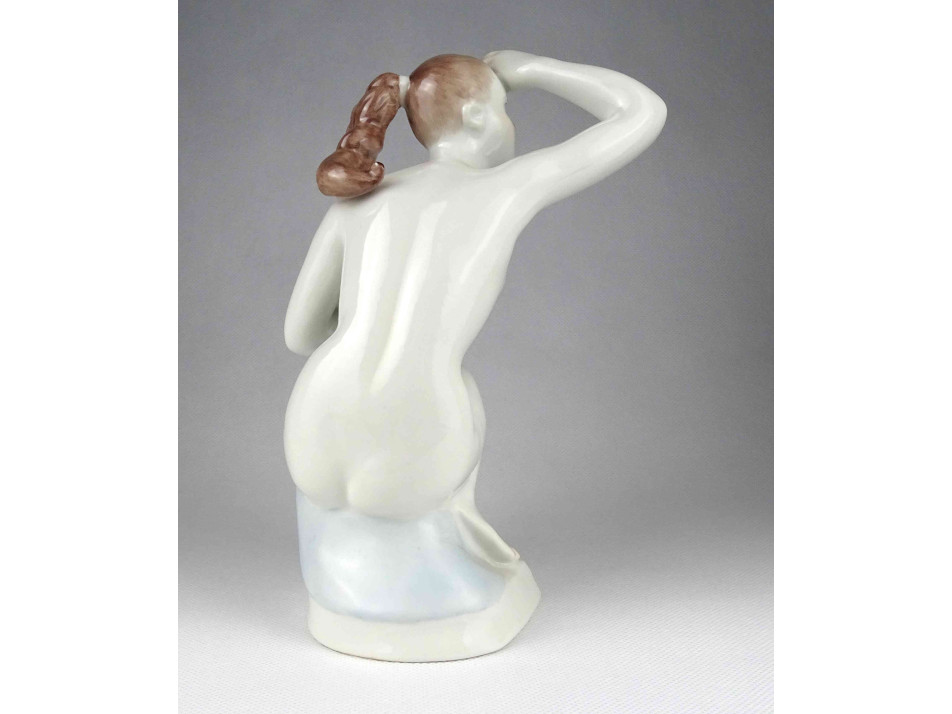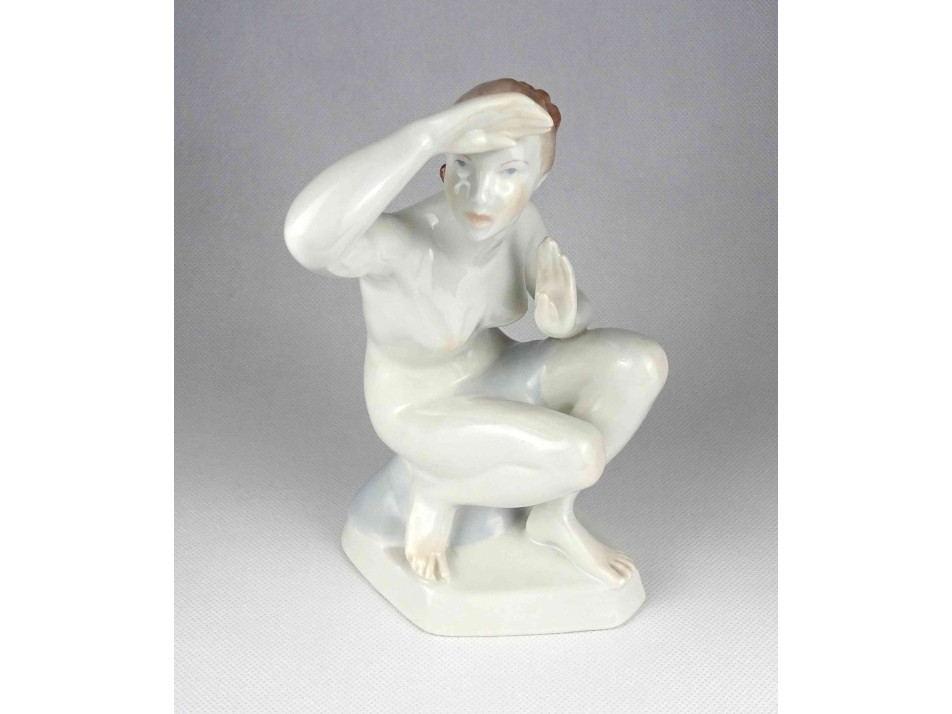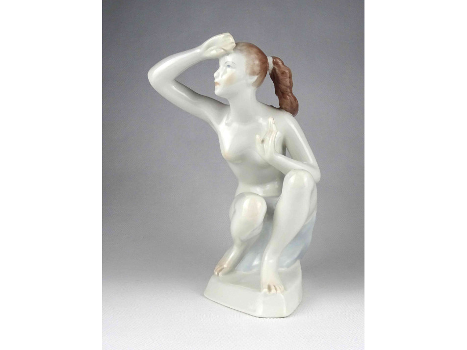 Régi nagyméretű Aquincum porcelán női napba néző akt 20.5 cm