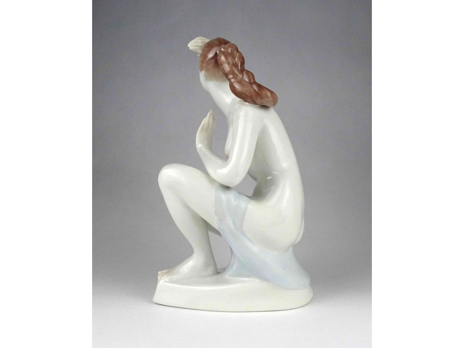 Hibátlan állapotú Aquincum porcelán térdelő női akt szobor, kézi festéssel díszítve.