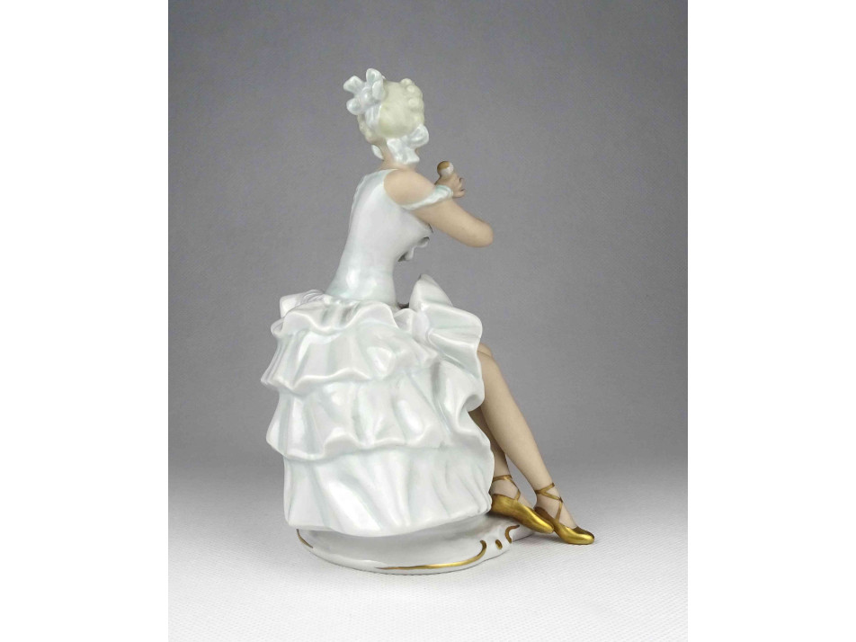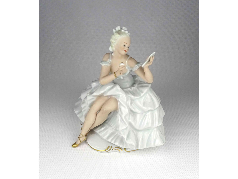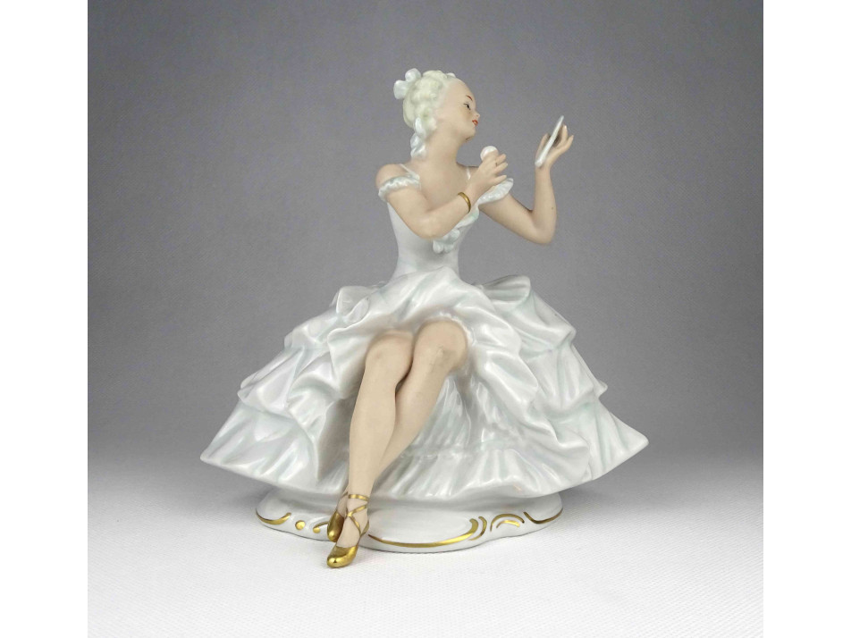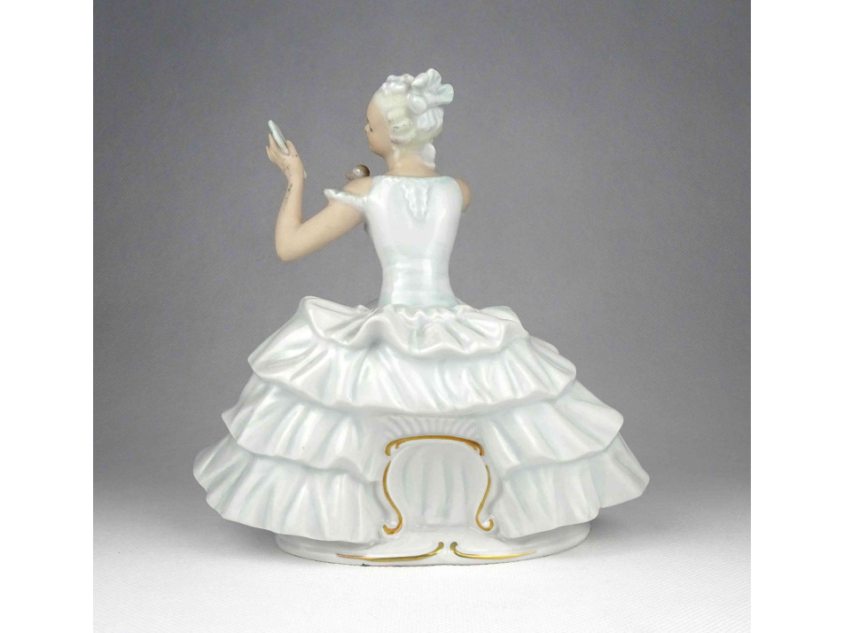 Régi, hibátlan állapotú, jelzett német Schaubachkunst porcelán primadonna, táncosnő figura. Sminkelő fiatal nő kezében tükörrel.