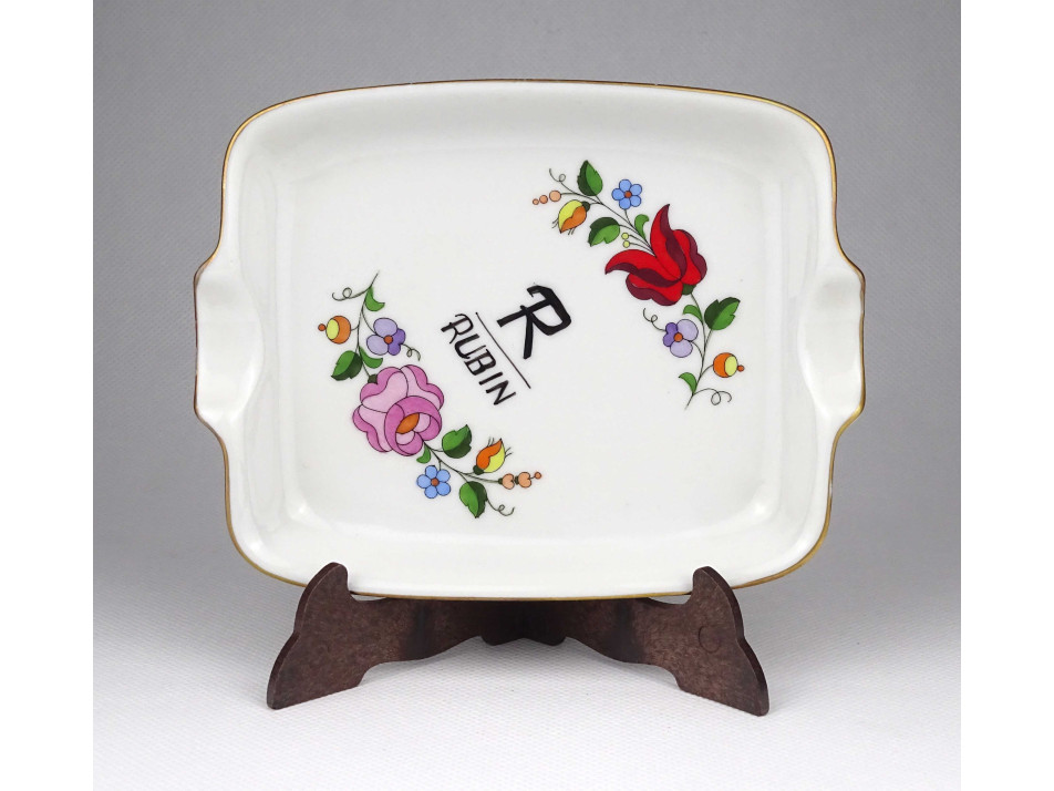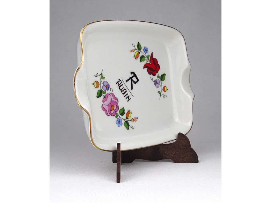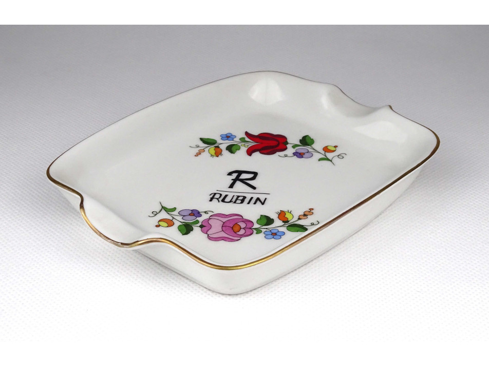 Rubin feliratú, aranyozott, kalocsai mintás porcelán hamutál