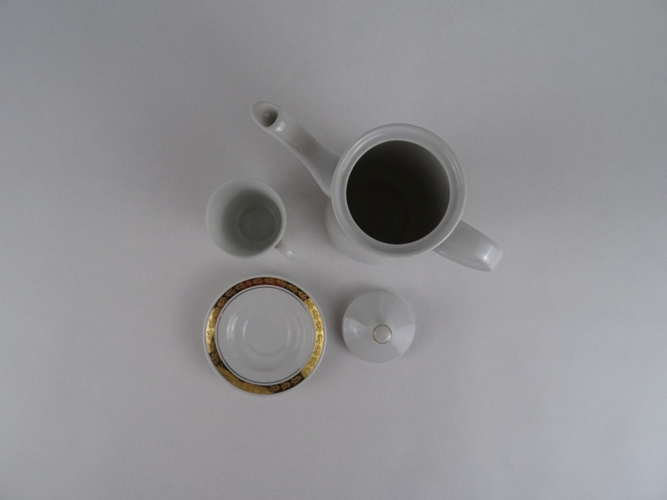 Hibátlan állapotú, porcelán kávés kanna és csésze, arany motívummal díszítve.