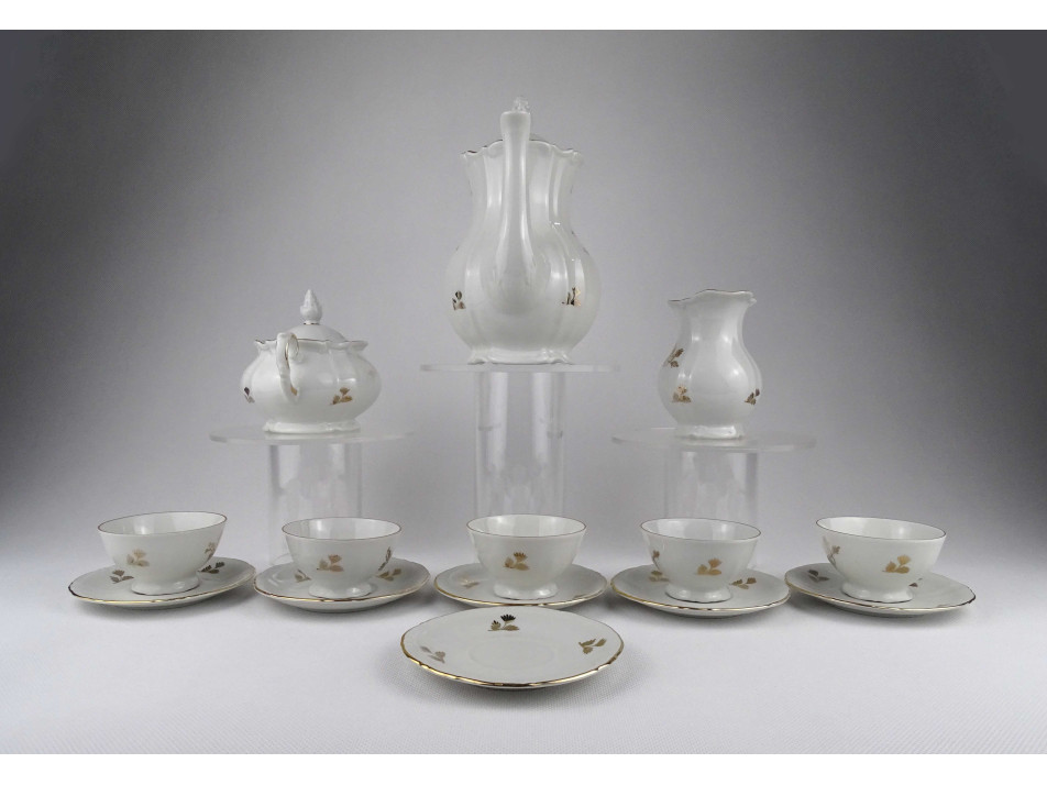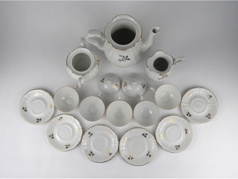 Régi német, 5 személyes Roschütz fehér arany porcelán kávészkészlet 14 darab