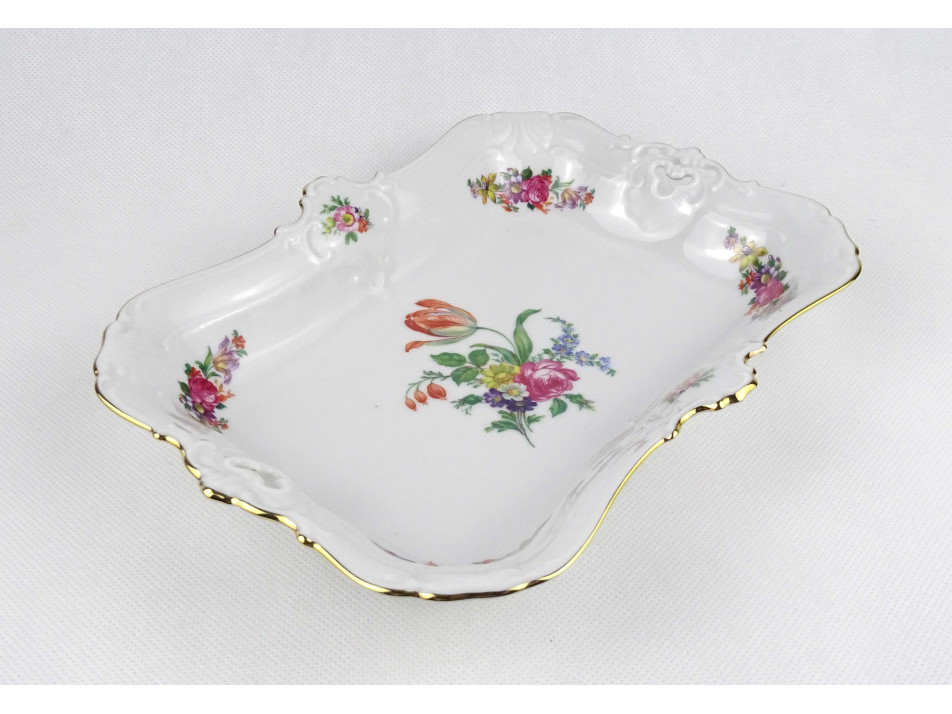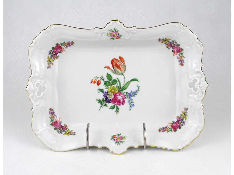 Hibátlan állapotú, jelzett, téglalap alakú virágmintás aranyozott Seltmann Weiden porcelán kínáló tál, kis tál.