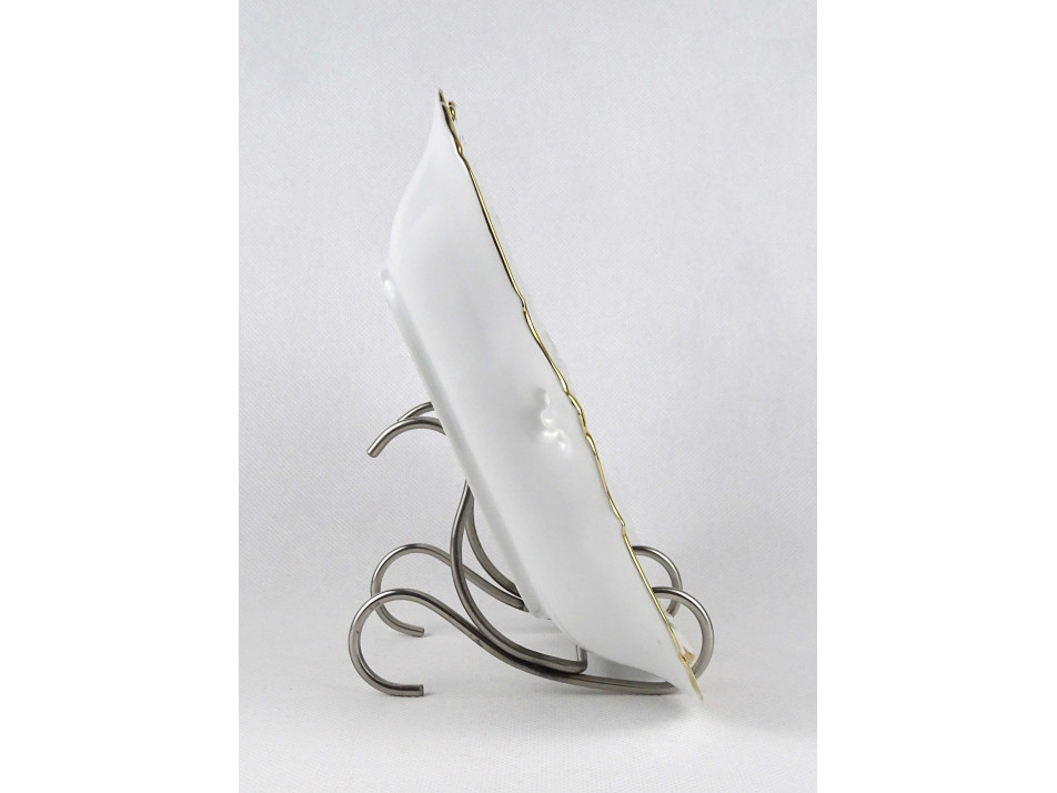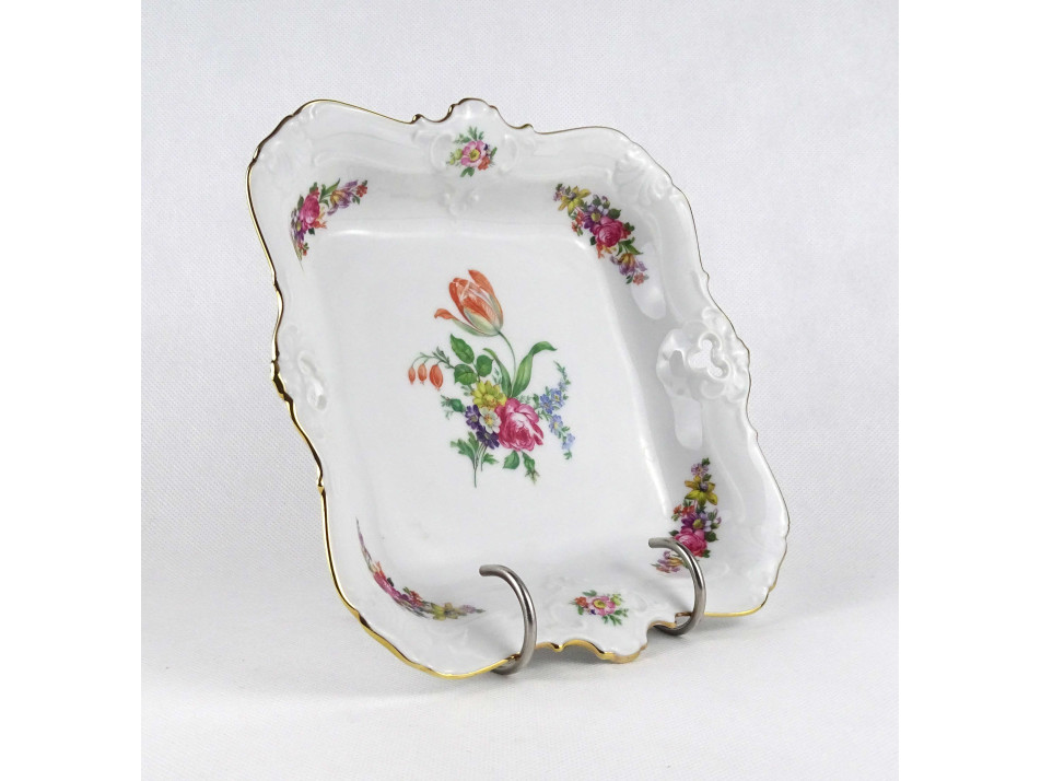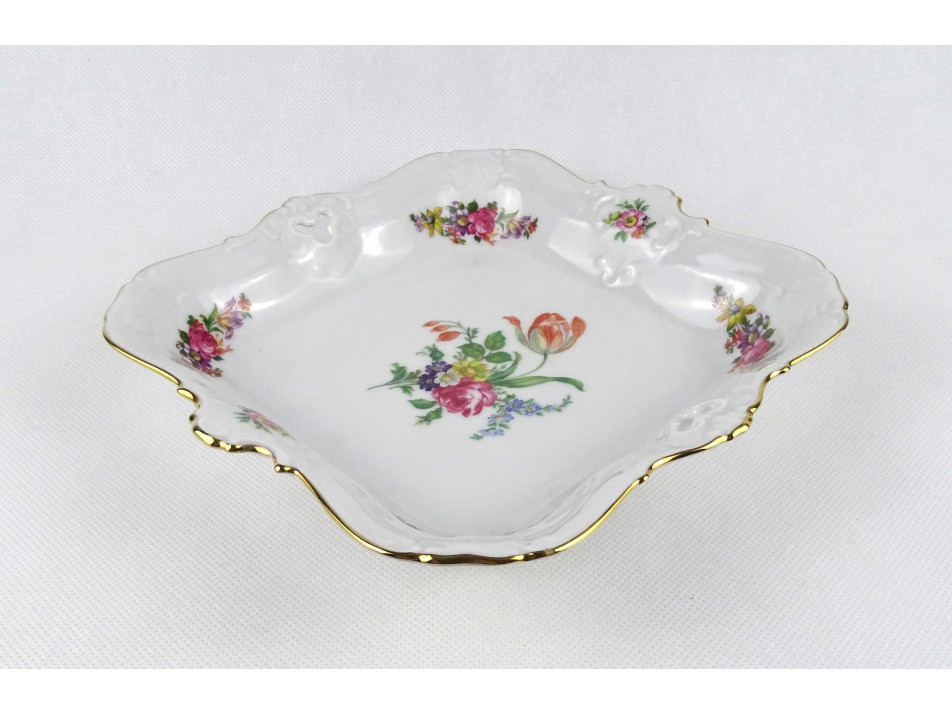 Hibátlan állapotú, jelzett, négyzet alakú, virágmintás, aranyozott szélű Seltmann Weiden porcelán kínáló tál, kis tál.