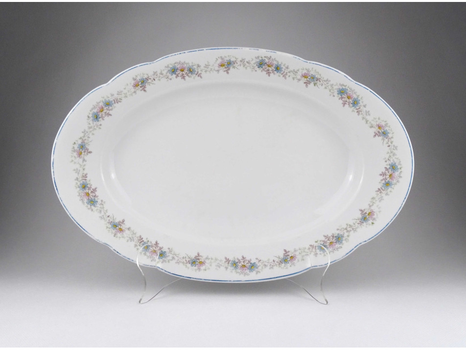 Régi, kék virágmintás, ovális Fischer & Mieg Pirkenhammer porcelán pecsenyéstál