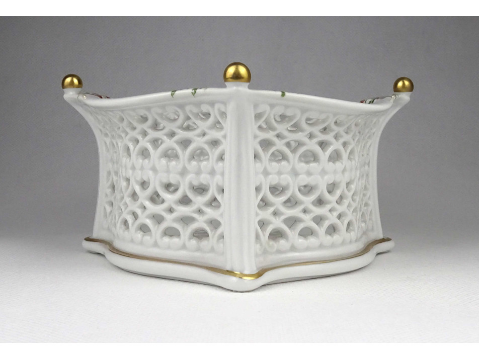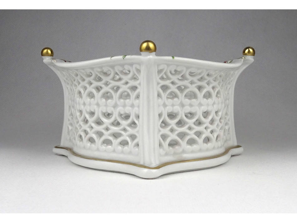 Hibátlan állapotú jelzett, nagyméretű porcelán kosár, asztalközép kínáló tál, gyümölcskínáló áttört mintákkal és virágdíszítéssel.