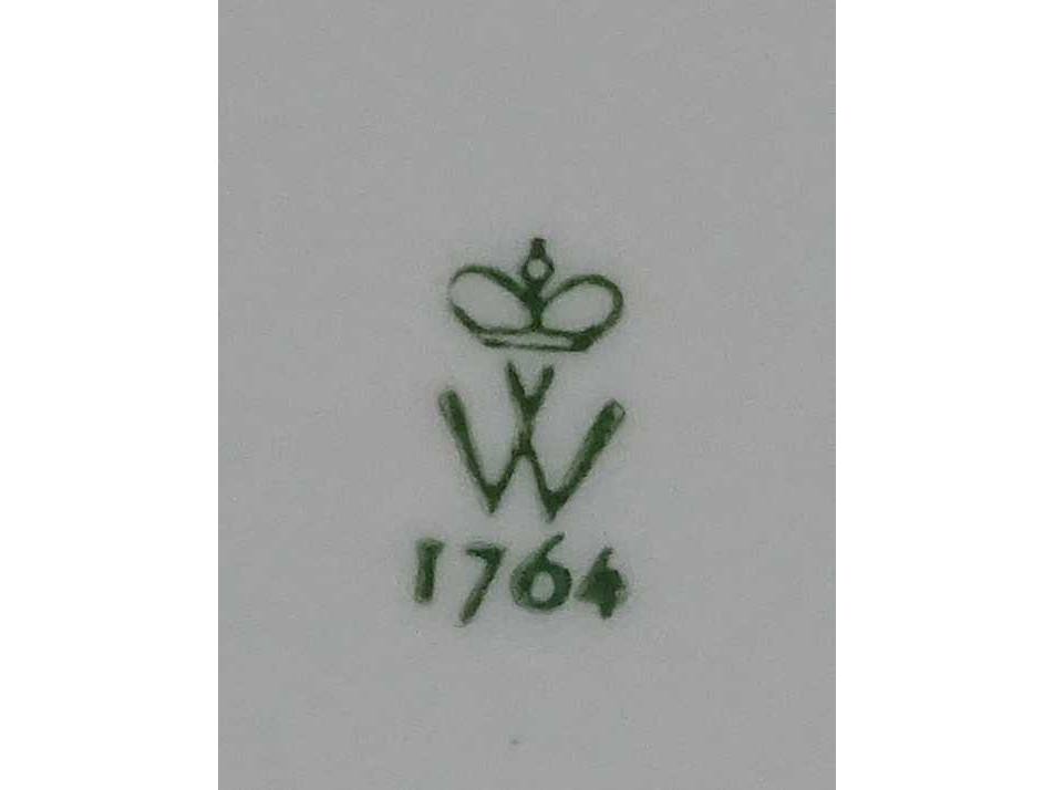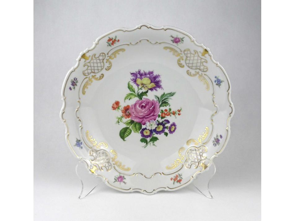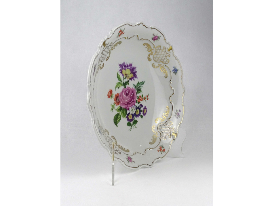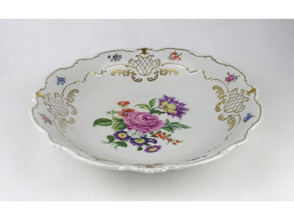 Nagyméretű, hibátlan állapotú, virágmintás, aranyozott, jelzett Wallendorf porcelán asztalközép kínáló tál.