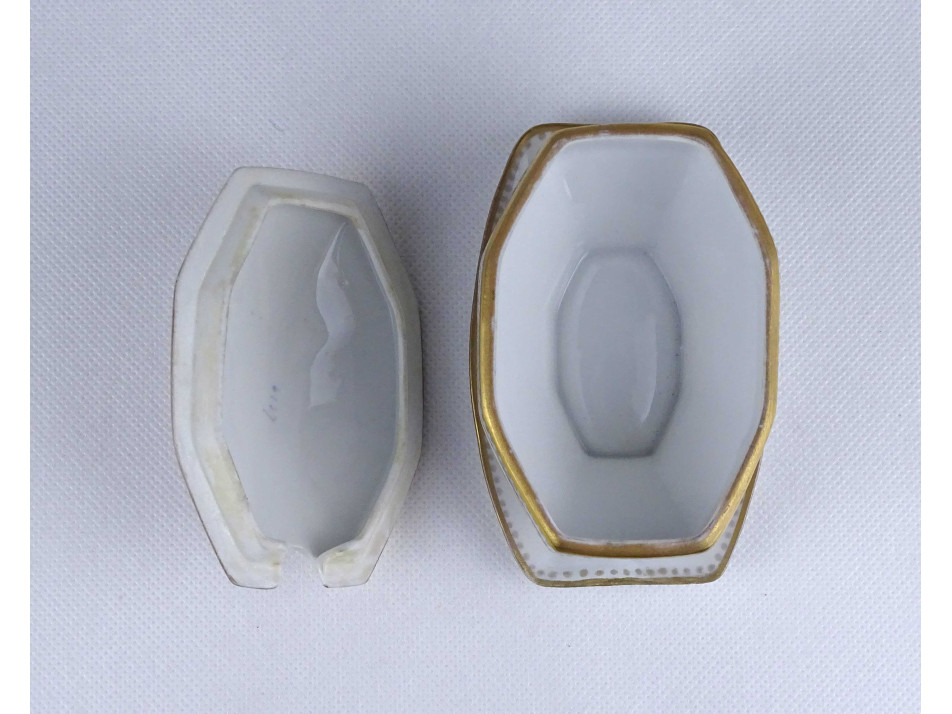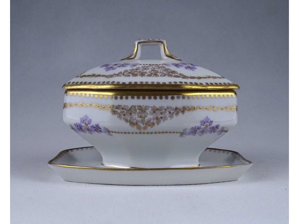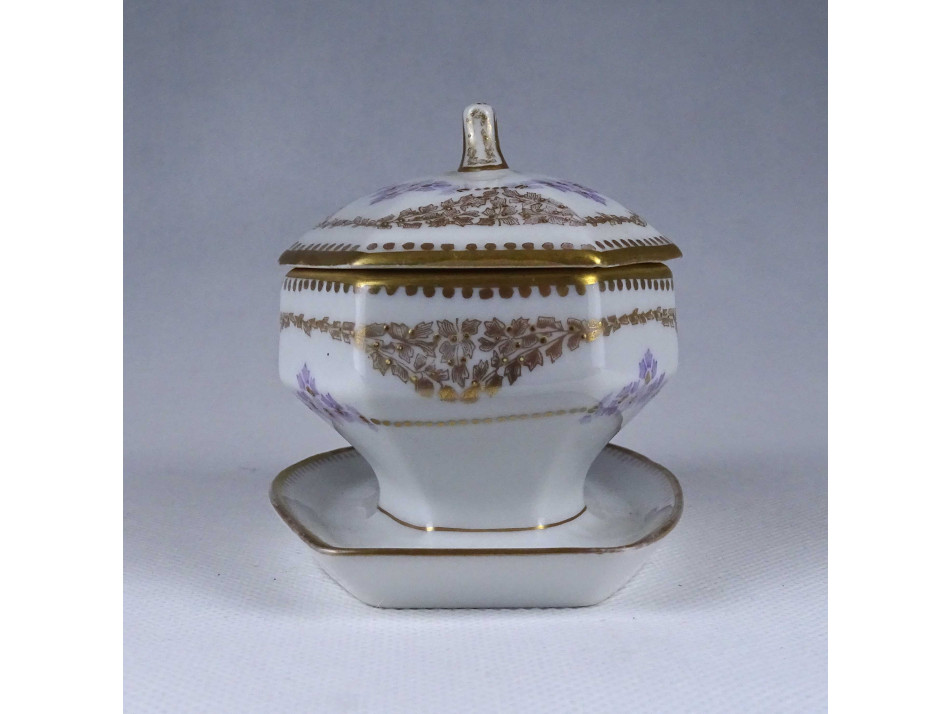 Régi, szép állapotú, gazdagon aranyozott apró virágmintás porcelán szószos tál fedővel. Aljának pereme restaurátor által szakszerűen javított.