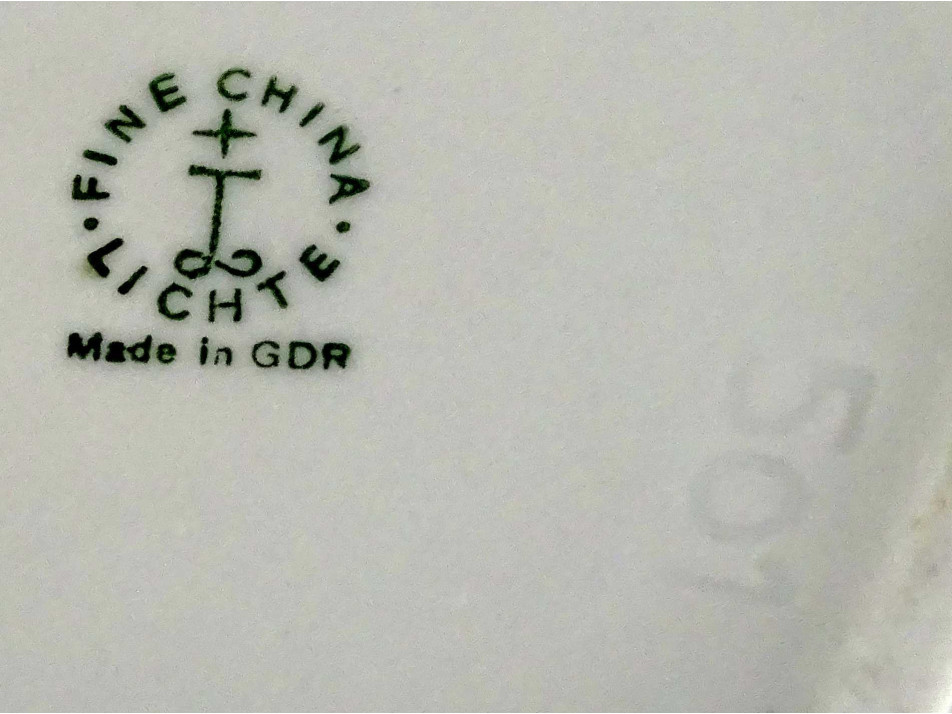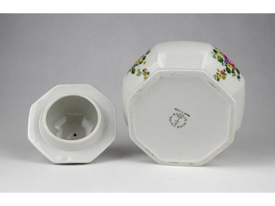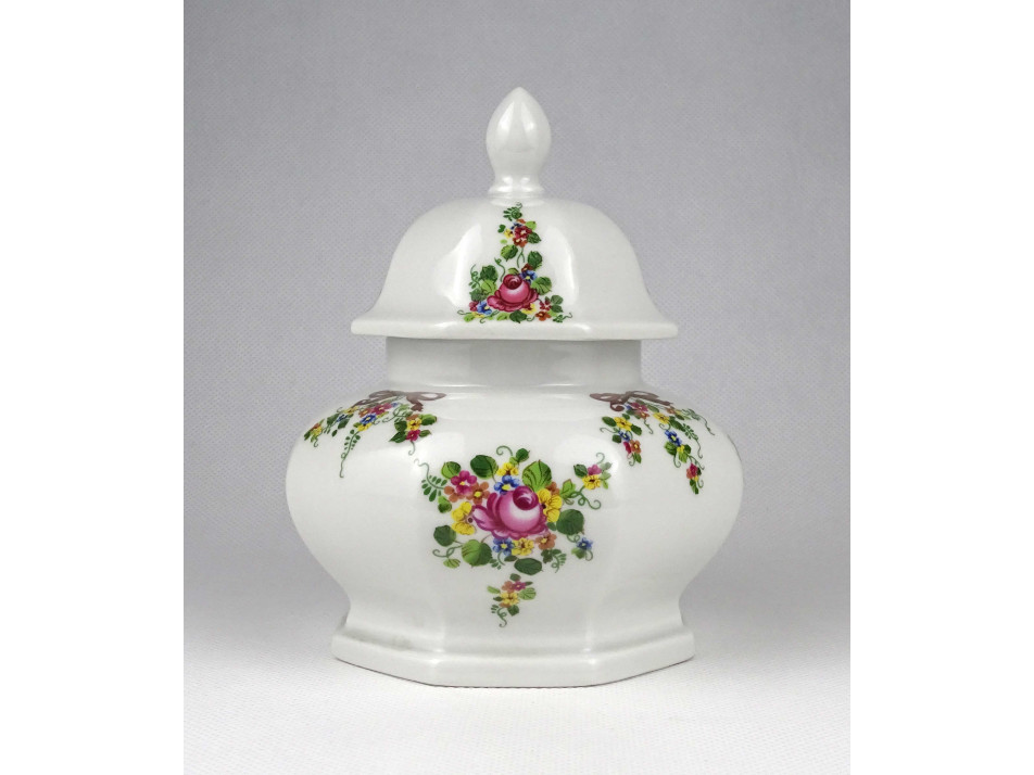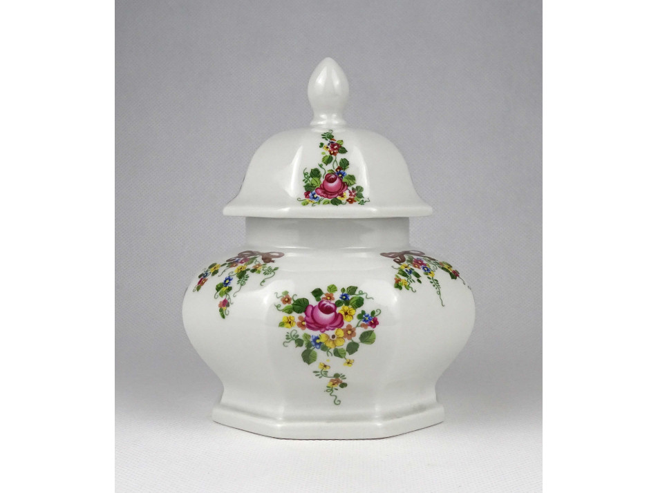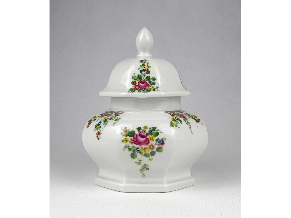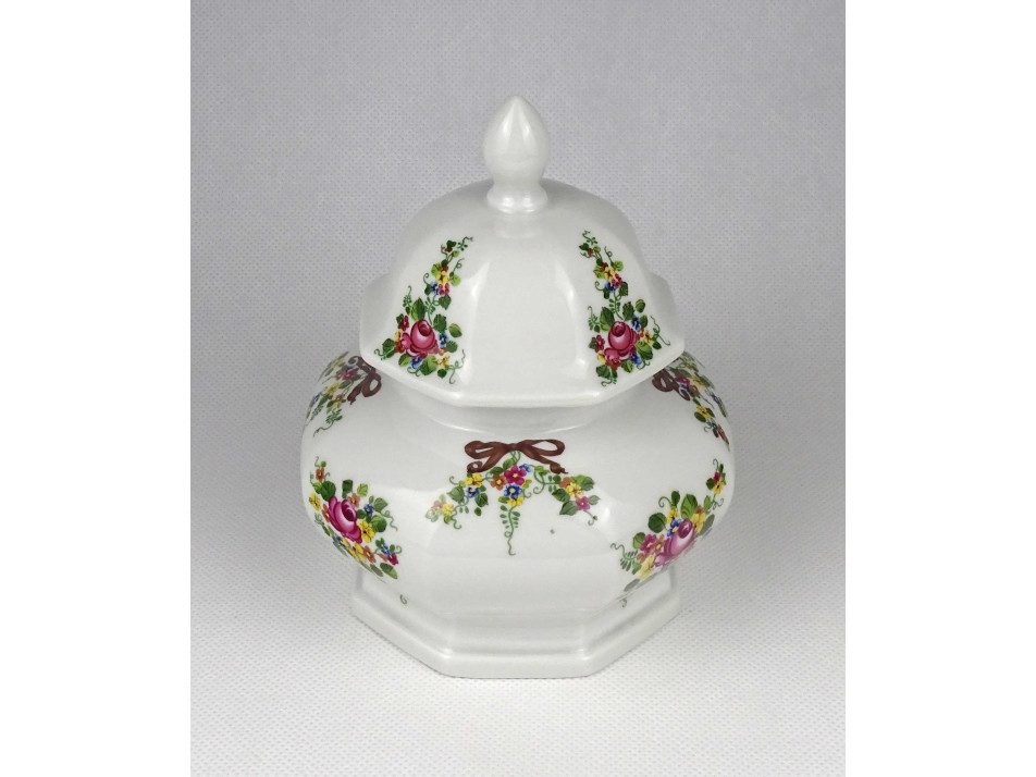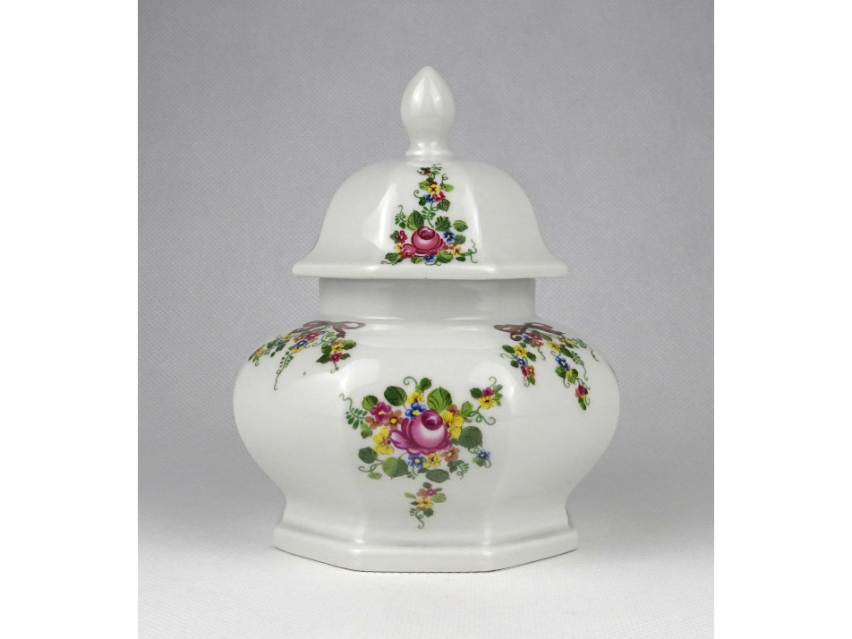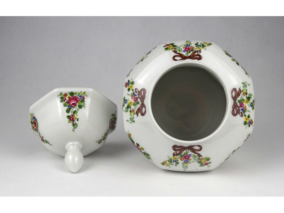 Hibátlan állapotú, szögletes, nyolcszög alakú, régi német Lichte porcelán bonbonier virágfüzér díszítéssel.