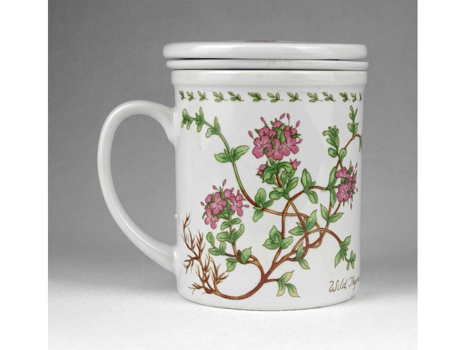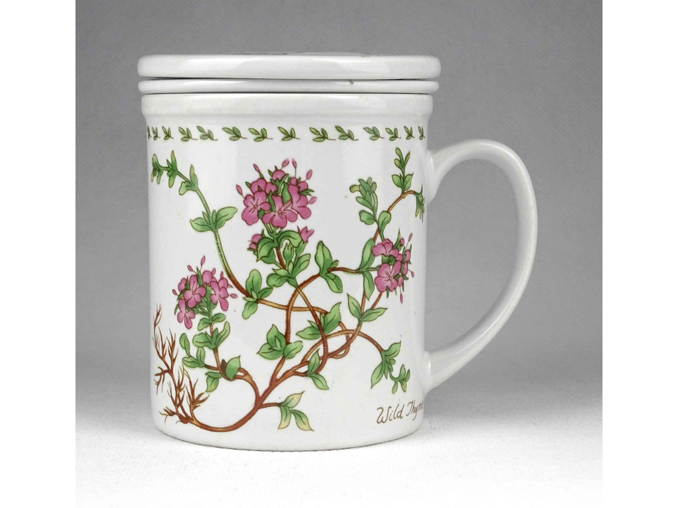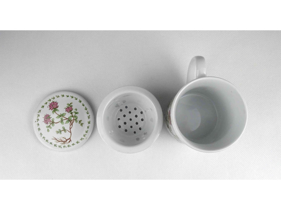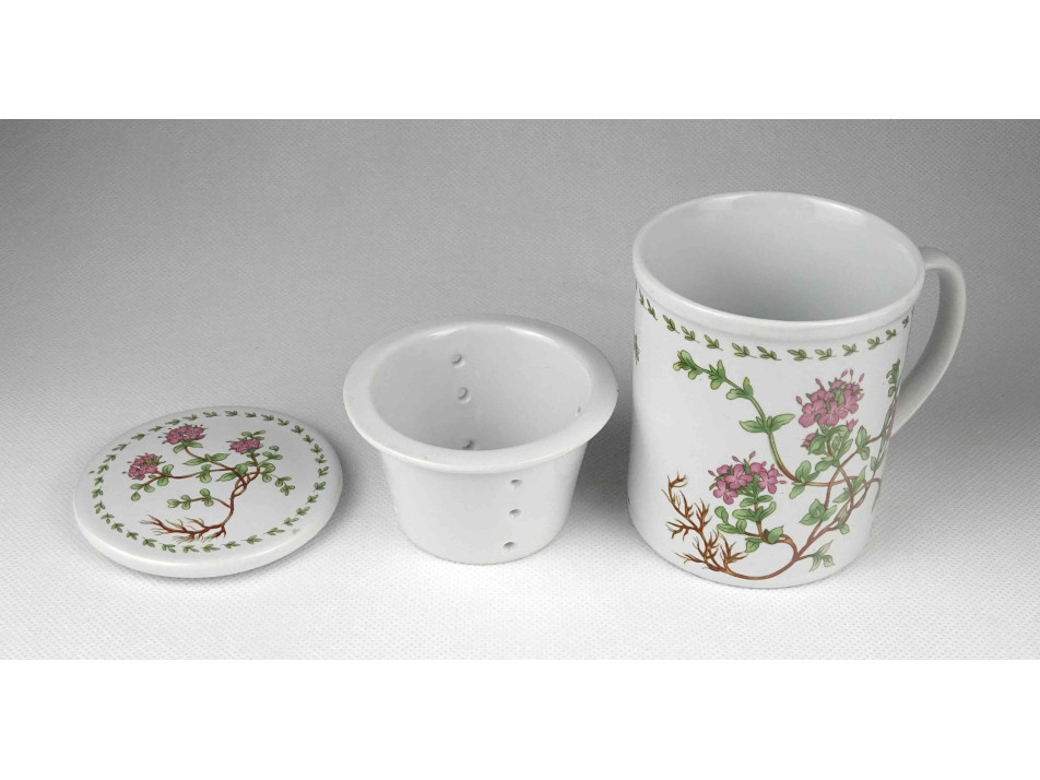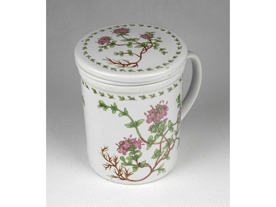 Hibátlan állapotú, jelzetlen, oldalán virágmintával díszített porcelán teáscsésze, teásbögre, benne teaszűrő, rajta fedél.